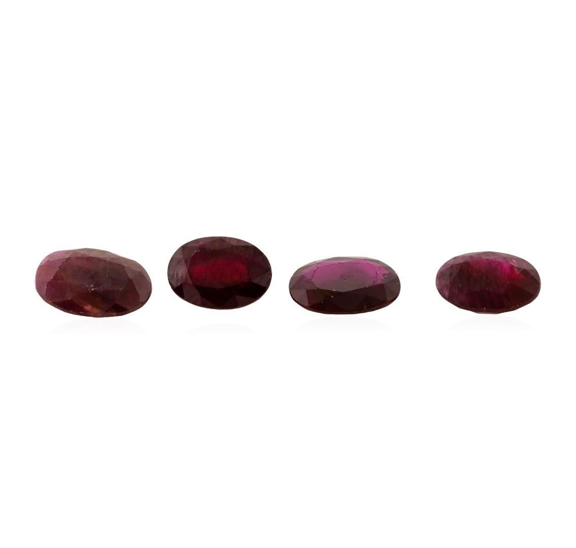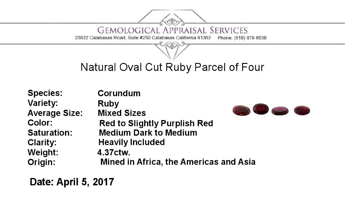 One natural oval cut ruby parcel of four with an exact weight of 4.37ctw., clarity is heavily included, red to slightly purplish red, medium dark to medium. Gemological Appraisals Services estimates the retail value at $874 GAS Appraised.