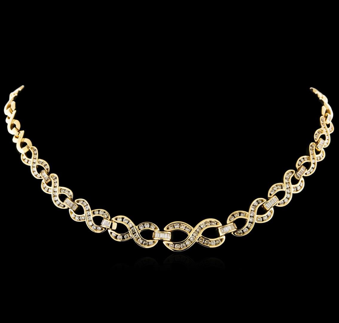 One electronically tested 14KT yellow gold ladies cast & assembled diamond necklace with a bright polish finish. Sixteen and one-quarter inch length necklace features a series of tapering diamond set "x" links, terminating in a concealed clasp with safety bar. Identified with markings of "14K". Condition is new, good workmanship. Containing: Forty-Six channel set round brilliant cut diamonds, measuring 2.20 - 2.00 x 1.26mm (depth est.) approximate total weight of 46 Stones = 1.65ct. Graded in the setting. Clarity: SI-2 to I-1. Color: H - J Eighty-Four channel set round brilliant cut diamonds, measuring 1.90 - 1.70 x 1.08mm (depth est.) approximate total weight of 84 Stones = 1.88ct. Graded in the setting. Clarity: SI-2 to I-1. Color: H - J Forty channel set baguette cut (tapered) diamonds, measuring from 2.10 x 1.00 x 0.70mm (depth est.) to 2.40 x 1.20 x 0.84mm (depth est.) approximate total weight of 40 Stones = 0.70ct. Graded in the setting. Clarity: SI-1 to I-1. Color: G - I Twenty channel set baguette cut (tapered) diamonds, measuring from 1.20 x 0.90 x 0.63mm (depth est.) to 1.50 x 1.00 x 0.70mm (depth est.) approximate total weight of 20 Stones = 0.15ct. Graded in the setting. Clarity: SI-1 to I-1. Color: G - I. Total Weight of Diamonds 4.38ct. Total Weight of Necklace 39.87gm. AIG Appraised at $17,900.00.