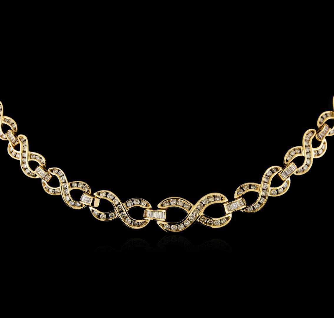 One electronically tested 14KT yellow gold ladies cast & assembled diamond necklace with a bright polish finish. Sixteen and one-quarter inch length necklace features a series of tapering diamond set "x" links, terminating in a concealed clasp with safety bar. Identified with markings of "14K". Condition is new, good workmanship. Containing: Forty-Six channel set round brilliant cut diamonds, measuring 2.20 - 2.00 x 1.26mm (depth est.) approximate total weight of 46 Stones = 1.65ct. Graded in the setting. Clarity: SI-2 to I-1. Color: H - J Eighty-Four channel set round brilliant cut diamonds, measuring 1.90 - 1.70 x 1.08mm (depth est.) approximate total weight of 84 Stones = 1.88ct. Graded in the setting. Clarity: SI-2 to I-1. Color: H - J Forty channel set baguette cut (tapered) diamonds, measuring from 2.10 x 1.00 x 0.70mm (depth est.) to 2.40 x 1.20 x 0.84mm (depth est.) approximate total weight of 40 Stones = 0.70ct. Graded in the setting. Clarity: SI-1 to I-1. Color: G - I Twenty channel set baguette cut (tapered) diamonds, measuring from 1.20 x 0.90 x 0.63mm (depth est.) to 1.50 x 1.00 x 0.70mm (depth est.) approximate total weight of 20 Stones = 0.15ct. Graded in the setting. Clarity: SI-1 to I-1. Color: G - I. Total Weight of Diamonds 4.38ct. Total Weight of Necklace 39.87gm. AIG Appraised at $17,900.00.