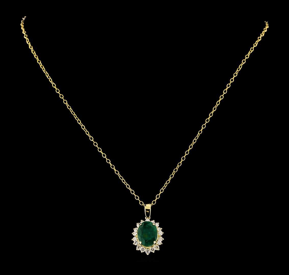 One electronically tested 14KT yellow gold lady's combination cast & assembled fashion pendant & chain 18.0' long, 1.9mm twisted oval shape link with a lobster claw clasp with a staggered basket halo with a bright polish finish. Identified with markings of '14K'. Condition is new, good workmanship. Containing: One prong set oval modified mixed cut natural emerald, measuring 12.92 x 9.61 x 5.30mm, (depth est.) 15%. bulge factor, approximate weight of 4.38ct., clarity is heavily included, medium dark, moderately strong, green color, (GIA G 6/4), cut is good. Transmitting light somewhat diffusely, semi-transparent to translucent. Naturally occurring internal & external characteristics are present. Indications of oil residue. Colored gemstones are presumed to have been subjected to commonly used enhancement processes. Graded in the setting. Eighteen prong set round brilliant cut diamonds, measuring 2.40 - 2.30 x 1.46mm (depth est.) approximate total weight of 18 Stones = 0.88ct. Graded in the setting. Clarity SI-1 to SI-2. Color: G - H Cut Good. Total Weight of Colored Stones 4.38ct.. Total Weight of Diamonds 0.88ct.. Total Weight of Pendant & Chain 6.90gm. GAS Appraised.