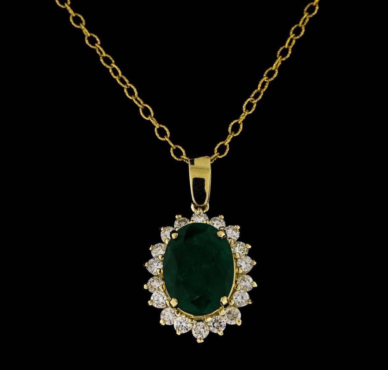 One electronically tested 14KT yellow gold lady's combination cast & assembled fashion pendant & chain 18.0' long, 1.9mm twisted oval shape link with a lobster claw clasp with a staggered basket halo with a bright polish finish. Identified with markings of '14K'. Condition is new, good workmanship. Containing: One prong set oval modified mixed cut natural emerald, measuring 12.92 x 9.61 x 5.30mm, (depth est.) 15%. bulge factor, approximate weight of 4.38ct., clarity is heavily included, medium dark, moderately strong, green color, (GIA G 6/4), cut is good. Transmitting light somewhat diffusely, semi-transparent to translucent. Naturally occurring internal & external characteristics are present. Indications of oil residue. Colored gemstones are presumed to have been subjected to commonly used enhancement processes. Graded in the setting. Eighteen prong set round brilliant cut diamonds, measuring 2.40 - 2.30 x 1.46mm (depth est.) approximate total weight of 18 Stones = 0.88ct. Graded in the setting. Clarity SI-1 to SI-2. Color: G - H Cut Good. Total Weight of Colored Stones 4.38ct.. Total Weight of Diamonds 0.88ct.. Total Weight of Pendant & Chain 6.90gm. GAS Appraised.