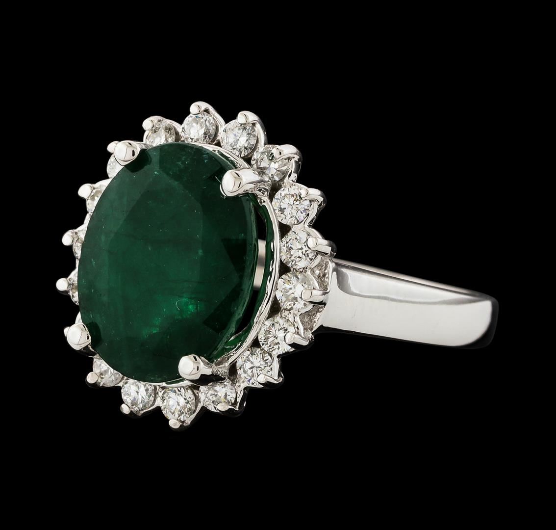 One electronically tested 14KT white gold lady's cast fashion ring with a basket halo with a bright polish finish. The featured lady's ring has a shank measuring 2.14 millimeters wide. Identified with markings of '14K'. Condition is new, good workmanship. Containing: One prong set oval modified mixed cut natural emerald, measuring 11.75 x 9.00 x 6.38mm, (depth est.) 13%. bulge factor, approximate weight of 4.38ct., clarity is heavily included, medium dark, moderately strong, green color, (GIA G 6/4), cut is good. Transmitting light somewhat diffusely, semi-transparent to translucent. Naturally occurring internal & external characteristics are present. Indications of oil residue. Colored gemstones are presumed to have been subjected to commonly used enhancement processes. Graded in the setting. Eighteen prong set round brilliant cut diamonds, measuring 2.00 - 1.90 x 1.17mm (depth est.) approximate total weight of 18 Stones = 0.48ct. Graded in the setting. Clarity VS-2 to SI-1. Color: H - I Cut Good. Total Weight of Colored Stones 4.38ct.. Total Weight of Diamonds 0.48ct.. Total Weight of Ring 5.40gm GAS Appraised at $4,995.00.