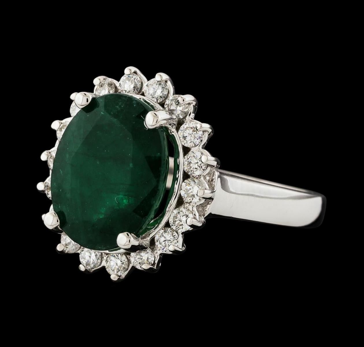 One electronically tested 14KT white gold lady's cast fashion ring with a basket halo with a bright polish finish. The featured lady's ring has a shank measuring 2.14 millimeters wide. Identified with markings of '14K'. Condition is new, good workmanship. Containing: One prong set oval modified mixed cut natural emerald, measuring 11.75 x 9.00 x 6.38mm, (depth est.) 13%. bulge factor, approximate weight of 4.38ct., clarity is heavily included, medium dark, moderately strong, green color, (GIA G 6/4), cut is good. Transmitting light somewhat diffusely, semi-transparent to translucent. Naturally occurring internal & external characteristics are present. Indications of oil residue. Colored gemstones are presumed to have been subjected to commonly used enhancement processes. Graded in the setting. Eighteen prong set round brilliant cut diamonds, measuring 2.00 - 1.90 x 1.17mm (depth est.) approximate total weight of 18 Stones = 0.48ct. Graded in the setting. Clarity VS-2 to SI-1. Color: H - I Cut Good. Total Weight of Colored Stones 4.38ct.. Total Weight of Diamonds 0.48ct.. Total Weight of Ring 5.40gm GAS Appraised.