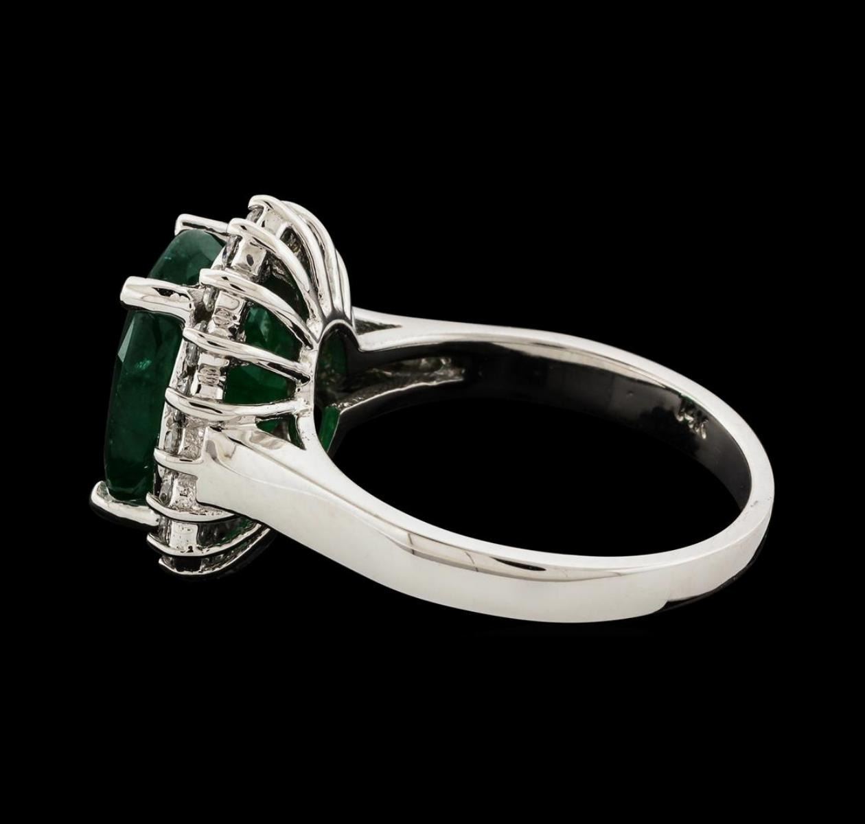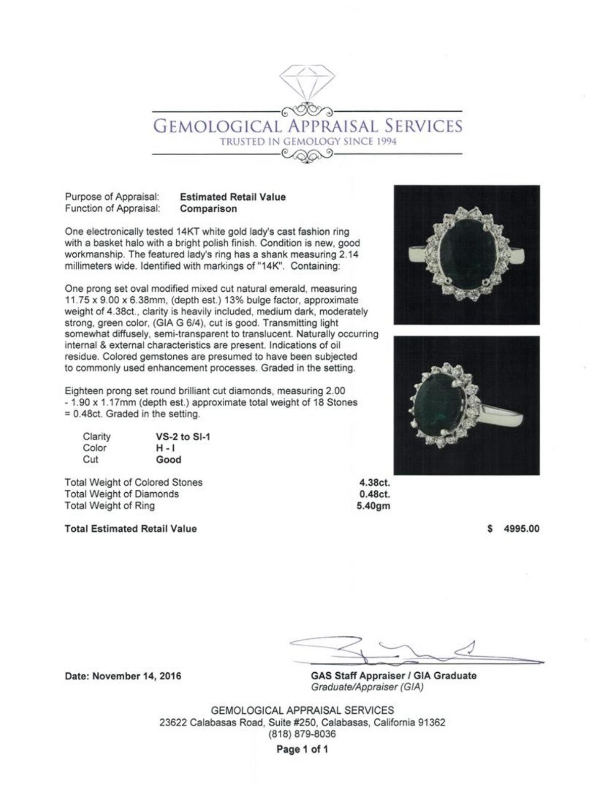 One electronically tested 14KT white gold lady's cast fashion ring with a basket halo with a bright polish finish. The featured lady's ring has a shank measuring 2.14 millimeters wide. Identified with markings of '14K'. Condition is new, good workmanship. Containing: One prong set oval modified mixed cut natural emerald, measuring 11.75 x 9.00 x 6.38mm, (depth est.) 13%. bulge factor, approximate weight of 4.38ct., clarity is heavily included, medium dark, moderately strong, green color, (GIA G 6/4), cut is good. Transmitting light somewhat diffusely, semi-transparent to translucent. Naturally occurring internal & external characteristics are present. Indications of oil residue. Colored gemstones are presumed to have been subjected to commonly used enhancement processes. Graded in the setting. Eighteen prong set round brilliant cut diamonds, measuring 2.00 - 1.90 x 1.17mm (depth est.) approximate total weight of 18 Stones = 0.48ct. Graded in the setting. Clarity VS-2 to SI-1. Color: H - I Cut Good. Total Weight of Colored Stones 4.38ct.. Total Weight of Diamonds 0.48ct.. Total Weight of Ring 5.40gm GAS Appraised.