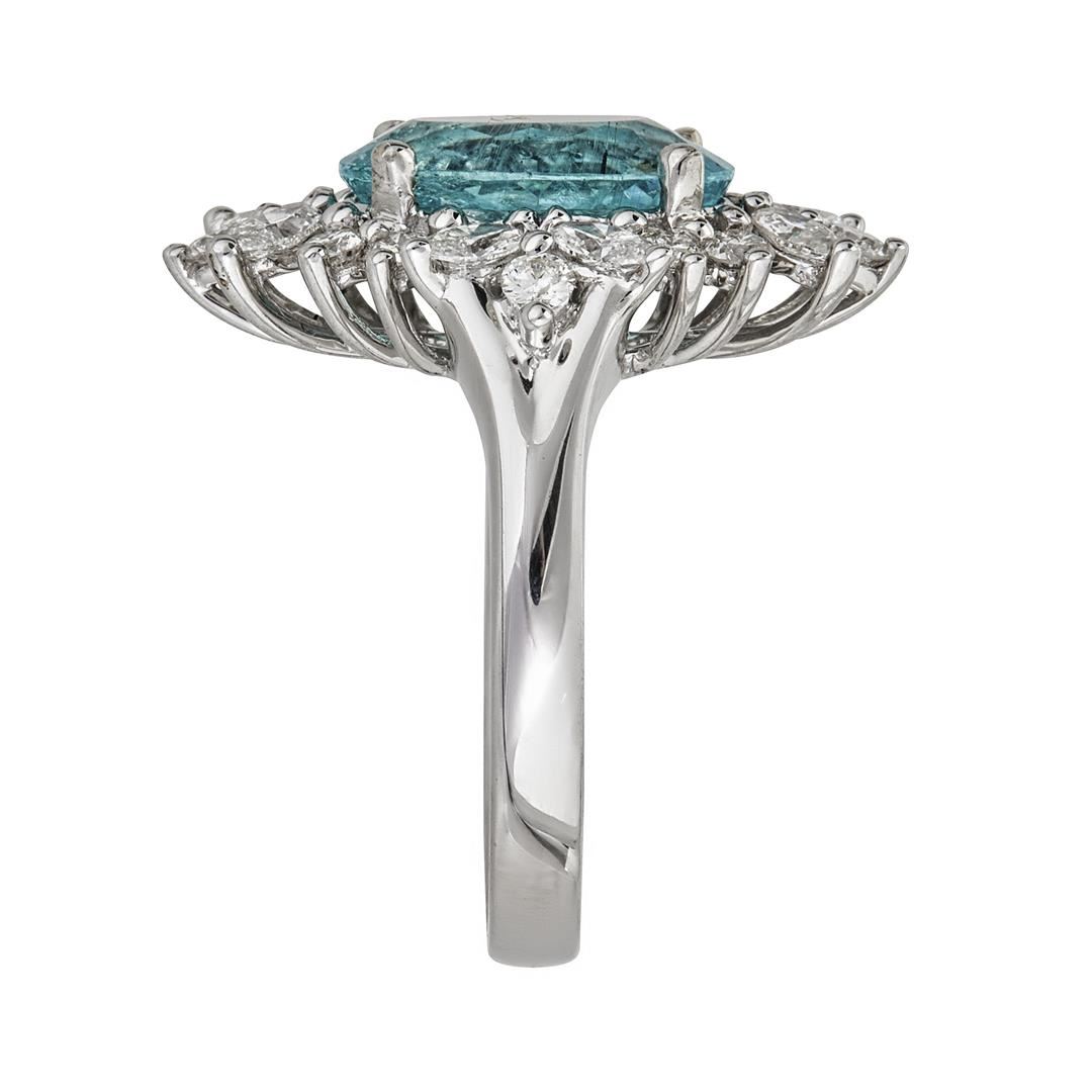 One 18KT white gold ring, weighing in total approx. 5.7 dwt., stamped "18K CJ 4.33", containing the following: One natural paraiba tourmaline, oval shape modified brilliant, measuring approx. 12.00 x 9.50 x 5.13 mm, weight estimated by formula 4.38ct, color: greenish blue transparent - good, color uniformity: good, proportions: good. Eight natural diamonds, marquise shape brilliant, measuring approx. 4.00 x 2.40 x 1.53 mm, weight estimated at 0.086ct each, in total 0.69ct, color: near colorless, clarity: SI2/I1, polish/symmetry: good/good. Twelve natural diamonds, round brilliant, measuring approx. 2.20 - 2.60 mm, weight estimated at 0.045ct each, in total 0.54ct, color: near colorless, clarity: SI2/I1, polish/symmetry: good/good. IGI Appraised at $24,680.00.