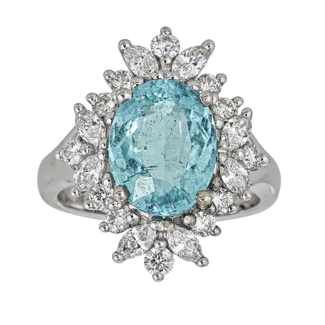 One 18KT white gold ring, weighing in total approx. 5.7 dwt., stamped "18K CJ 4.33", containing the following: One natural paraiba tourmaline, oval shape modified brilliant, measuring approx. 12.00 x 9.50 x 5.13 mm, weight estimated by formula 4.38ct, color: greenish blue transparent - good, color uniformity: good, proportions: good. Eight natural diamonds, marquise shape brilliant, measuring approx. 4.00 x 2.40 x 1.53 mm, weight estimated at 0.086ct each, in total 0.69ct, color: near colorless, clarity: SI2/I1, polish/symmetry: good/good. Twelve natural diamonds, round brilliant, measuring approx. 2.20 - 2.60 mm, weight estimated at 0.045ct each, in total 0.54ct, color: near colorless, clarity: SI2/I1, polish/symmetry: good/good. IGI Appraised at $24,680.00.