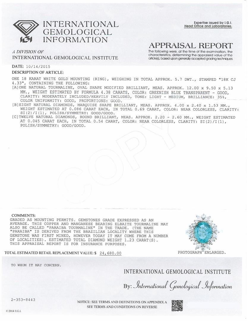 One 18KT white gold ring, weighing in total approx. 5.7 dwt., stamped "18K CJ 4.33", containing the following: One natural paraiba tourmaline, oval shape modified brilliant, measuring approx. 12.00 x 9.50 x 5.13 mm, weight estimated by formula 4.38ct, color: greenish blue transparent - good, color uniformity: good, proportions: good. Eight natural diamonds, marquise shape brilliant, measuring approx. 4.00 x 2.40 x 1.53 mm, weight estimated at 0.086ct each, in total 0.69ct, color: near colorless, clarity: SI2/I1, polish/symmetry: good/good. Twelve natural diamonds, round brilliant, measuring approx. 2.20 - 2.60 mm, weight estimated at 0.045ct each, in total 0.54ct, color: near colorless, clarity: SI2/I1, polish/symmetry: good/good. IGI Appraised at $24,680.00.