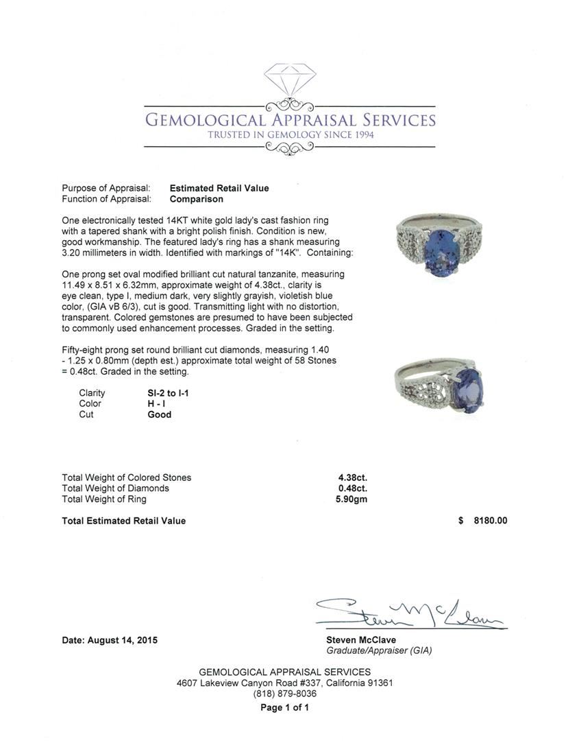 One electronically tested 14KT white gold lady's cast fashion ring with a tapered shank with a bright polish finish. The featured lady's ring has a shank measuring 3.20 millimeters in width. Identified with markings of "14K". Condition is new, good workmanship. Containing: One prong set oval modified brilliant cut natural tanzanite, measuring 11.49 x 8.51 x 6.32mm, approximate weight of 4.38ct., clarity is eye clean, type I, medium dark, very slightly grayish, violetish blue color, (GIA vB 6/3), cut is good. Transmitting light with no distortion, transparent. Colored gemstones are presumed to have been subjected to commonly used enhancement processes. Graded in the setting. Fifty-Eight prong set round brilliant cut diamonds, measuring 1.40 - 1.25 x 0.80mm (depth est.) approximate total weight of 58 Stones = 0.48ct. Graded in the setting. Clarity: SI-2 to I-1. Color: H - I. Cut Good. Total Weight of Colored Stones 4.38ct. Total Weight of Diamonds 0.48ct. Total Weight of Ring 5.90gm. GAS Appraised at $8,180.00.