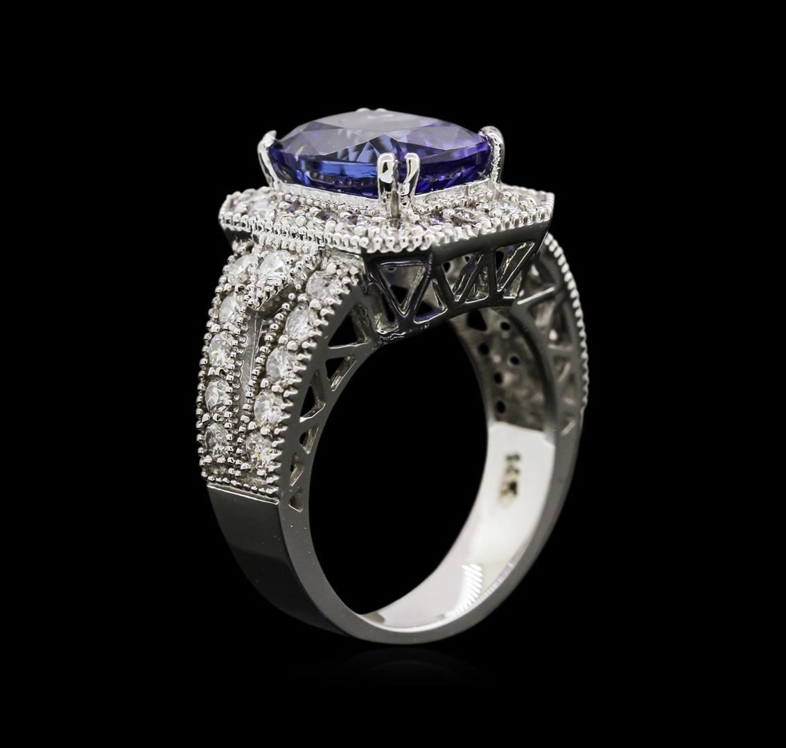 One electronically tested 14KT white gold lady's cast fashion ring with a halo with a bright polish finish. The featured lady's ring has a shank measuring 4.61mm wide. Identified with markings of "14K". Condition is new, good workmanship. Containing: One prong set rectangular cushion modified brilliant cut natural tanzanite, measuring 10.25 x 8.47 x 6.26mm, 3% bulge factor, approximate weight of 4.38ct., clarity is eye clean, type I, medium dark, very slightly grayish, violetish blue color, (GIA vB 6/3), cut is very good. Transmitting light with no distortion, transparent. Colored gemstones are presumed to have been subjected to commonly used enhancement processes. Graded in the setting. Forty prong set round brilliant cut diamonds, measuring 2.10 - 2.00 x 1.31mm (depth est.) approximate total weight of 40 Stones = 1.36ct. Graded in the setting. Clarity: SI-2 to I-1. Color: H - J. Cut Good. Total Weight of Colored Stones 4.38ct. Total Weight of Diamonds 1.36ct. Total Weight of Ring 9.10gm. GAS Appraised at $9,740.00.