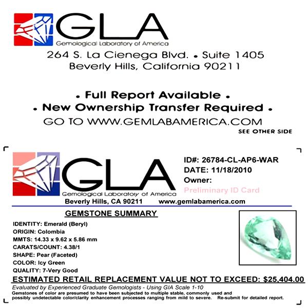 Excellent icy green colored specimen pear cut; lab quality evaluation 7; treatment as noted; Gem Guide wholesale $3942-$6570; full retail appraisal $25404; full lab evaluation available