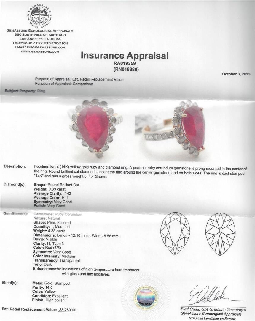 Fourteen karat (14K) yellow gold ruby and diamond ring. A pear cut ruby corundum gemstone is prong mounted in the center of the ring. Round brilliant cut diamonds accent the ring around the center gemstone and on both sides. The ring is cast stamped "14K" and has a gross weight of 4.4 Grams. Diamond(s): Shape: Round Brilliant Cut. Weight: 0.39 carat. Average Clarity: I1-I2. Average Color: H-J. Symmetry: Very Good. Polish: Very Good. Gemstone(s): GemStone: Ruby Corundum. Nature: Natural. Shape: Pear, Faceted. Quantity: 1, Mounted. Weight 4.38 carat. Dimensions: Length-12.10 mm. ; Width- 8.56 mm. Bulge: Visible. Clarity: I1, Type 3. Color: Red (5/5). Symmetry: Very Good. Color Intensity: Medium. Transparency: Transparent. Tone: Dark. Enhancements: Indications of high temperature heat treatment, with glass and flux additives. Metal(s): Metal: Gold, Stamped. Purity: 14K. Color: Yellow. Condition: Excellent. Finish: High polish. GGA Appraised.