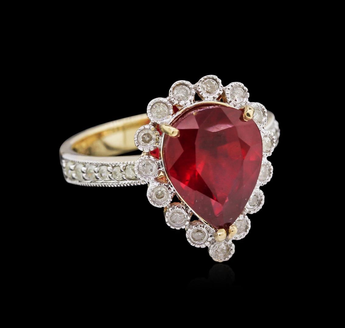 Fourteen karat (14K) yellow gold ruby and diamond ring. A pear cut ruby corundum gemstone is prong mounted in the center of the ring. Round brilliant cut diamonds accent the ring around the center gemstone and on both sides. The ring is cast stamped "14K" and has a gross weight of 4.4 Grams. Diamond(s): Shape: Round Brilliant Cut. Weight: 0.39 carat. Average Clarity: I1-I2. Average Color: H-J. Symmetry: Very Good. Polish: Very Good. Gemstone(s): GemStone: Ruby Corundum. Nature: Natural. Shape: Pear, Faceted. Quantity: 1, Mounted. Weight 4.38 carat. Dimensions: Length-12.10 mm. ; Width- 8.56 mm. Bulge: Visible. Clarity: I1, Type 3. Color: Red (5/5). Symmetry: Very Good. Color Intensity: Medium. Transparency: Transparent. Tone: Dark. Enhancements: Indications of high temperature heat treatment, with glass and flux additives. Metal(s): Metal: Gold, Stamped. Purity: 14K. Color: Yellow. Condition: Excellent. Finish: High polish. GGA Appraised.