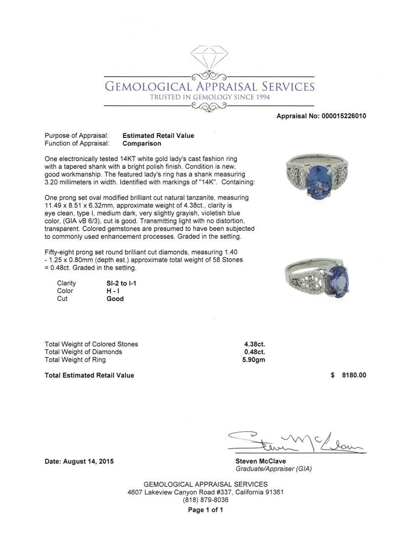 One electronically tested 14KT white gold lady's cast fashion ring with a tapered shank with a bright polish finish. The featured lady's ring has a shank measuring 3.20 millimeters in width. Identified with markings of "14K". Condition is new, good workmanship. Containing: One prong set oval modified brilliant cut natural tanzanite, measuring 11.49 x 8.51 x 6.32mm, approximate weight of 4.38ct., clarity is eye clean, type I, medium dark, very slightly grayish, violetish blue color, (GIA vB 6/3), cut is good. Transmitting light with no distortion, transparent. Colored gemstones are presumed to have been subjected to commonly used enhancement processes. Graded in the setting. Fifty-Eight prong set round brilliant cut diamonds, measuring 1.40 - 1.25 x 0.80mm (depth est.) approximate total weight of 58 Stones = 0.48ct. Graded in the setting. Clarity: SI-2 to I-1. Color: H - I. Cut Good. Total Weight of Colored Stones 4.38ct. Total Weight of Diamonds 0.48ct. Total Weight of Ring 5.90gm. GAS Appraised at $8,180.00.