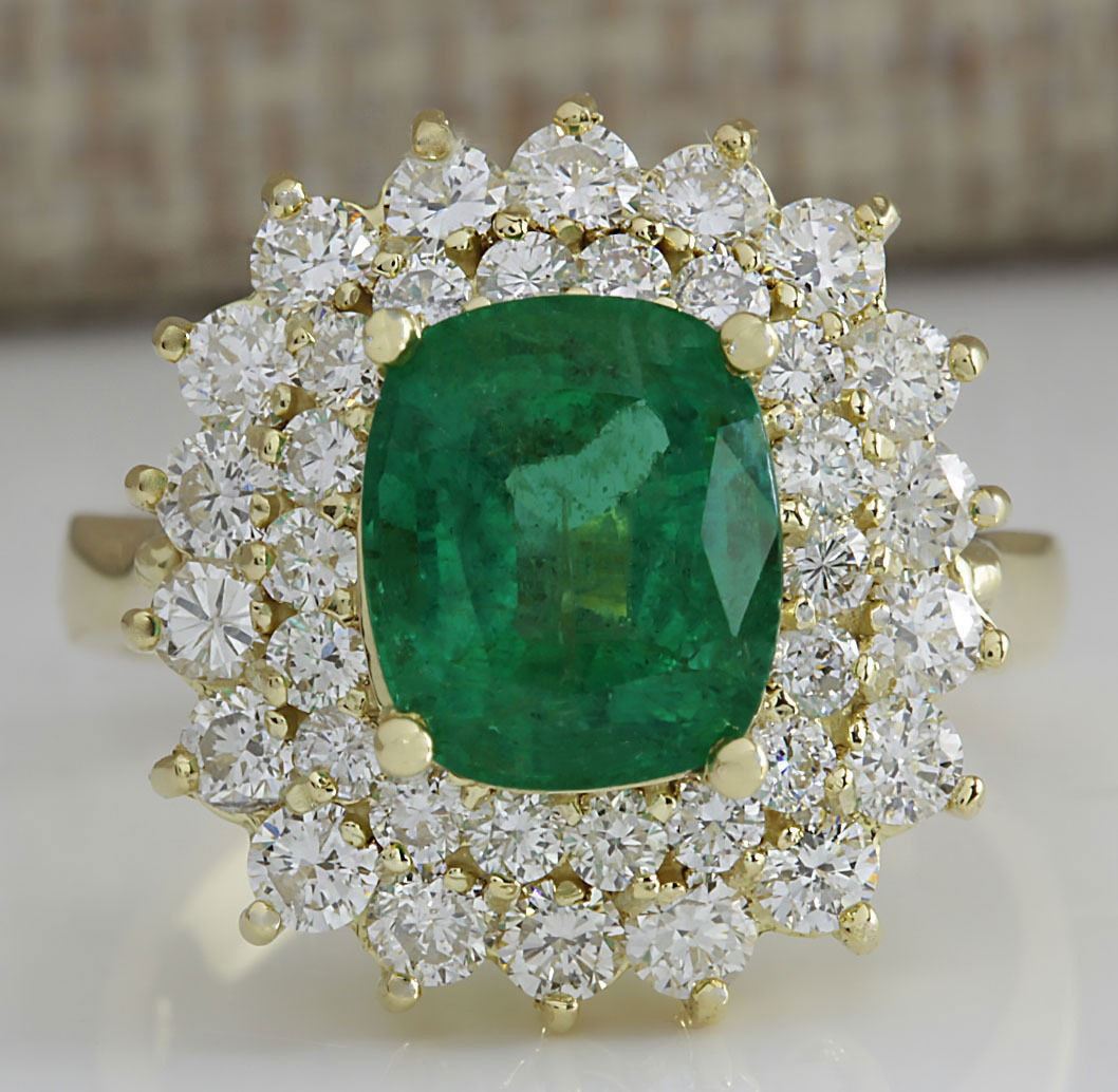 4.39 CTW Natural Emerald And Diamond Ring 18K Solid Yellow Gold