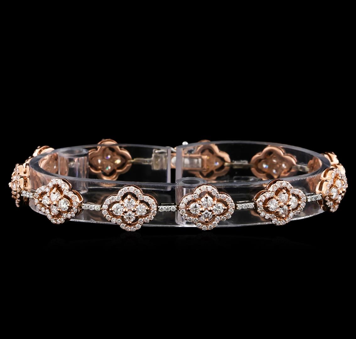 One electronically tested 14KT rose and white gold lady's combination cast & assembled fashion bracelet with a tongue clasp with foldover safety with a bright polish finish. The featured lady's bracelet measures 7 inches in length. Identified with markings of "K14". Condition is new, good workmanship. Containing: Forty-Four prong set round brilliant cut diamonds, measuring 2.50 - 2.40 x 1.52mm (depth est.) approximate total weight of 44 Stones = 2.49ct. Graded in the setting. Clarity: SI-1 to SI-2. Color: G - H. Cut Good Two Hundred Ninety-Seven prong set round brilliant cut diamonds, measuring 1.25 - 1.15 x 0.73mm (depth est.) approximate total weight of 297 Stones = 1.90ct. Graded in the setting. Clarity: SI-1 to I-1. Color: G - Good. Total Weight of Diamonds 4.39ct. Total Weight of Bracelet 15.20gm GAS Appraised at $13,140.00.