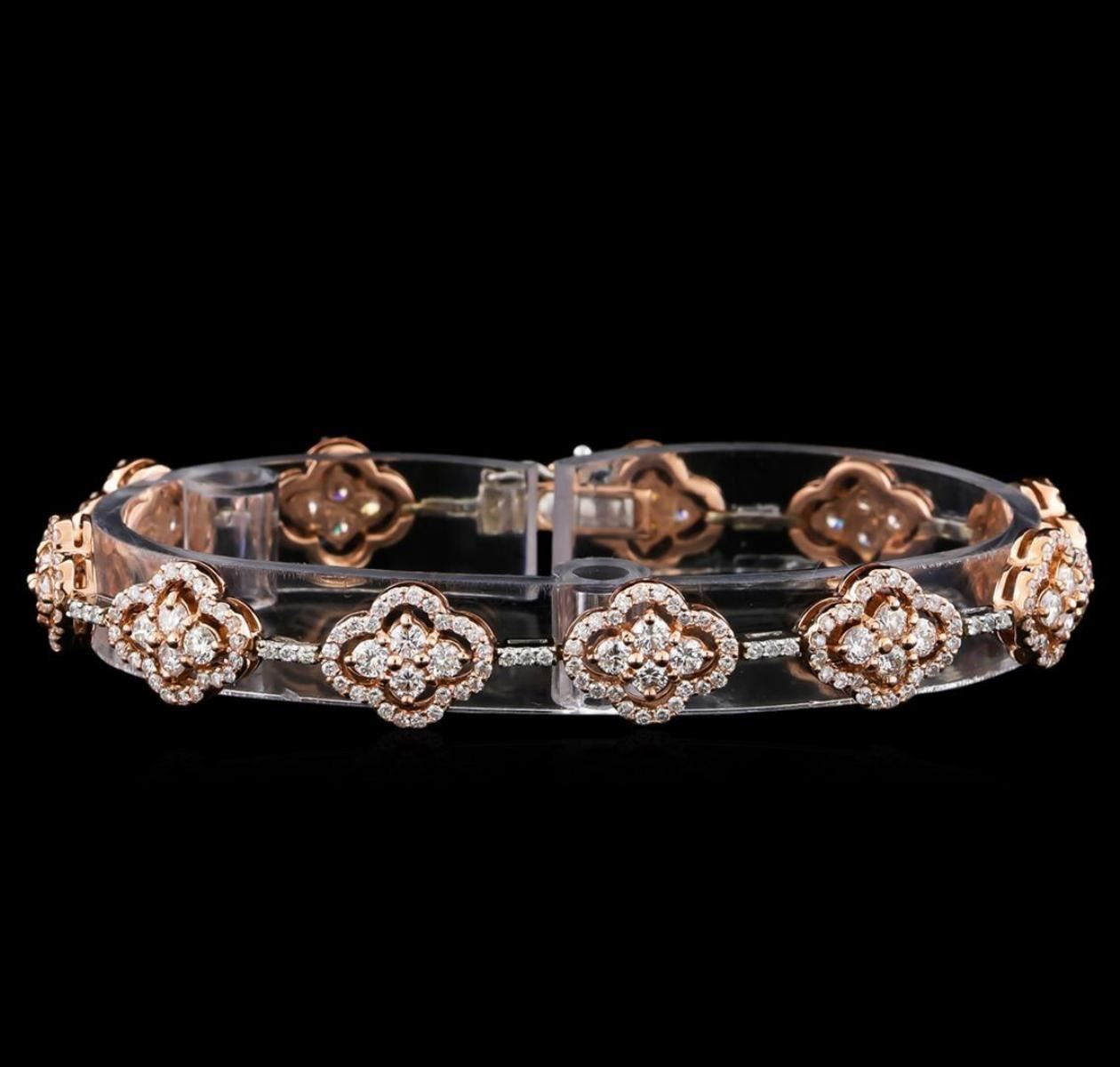 One electronically tested 14KT rose and white gold lady's combination cast & assembled fashion bracelet with a tongue clasp with foldover safety with a bright polish finish. The featured lady's bracelet measures 7 inches in length. Identified with markings of "K14". Condition is new, good workmanship. Containing: Forty-Four prong set round brilliant cut diamonds, measuring 2.50 - 2.40 x 1.52mm (depth est.) approximate total weight of 44 Stones = 2.49ct. Graded in the setting. Clarity: SI-1 to SI-2. Color: G - H. Cut Good Two Hundred Ninety-Seven prong set round brilliant cut diamonds, measuring 1.25 - 1.15 x 0.73mm (depth est.) approximate total weight of 297 Stones = 1.90ct. Graded in the setting. Clarity: SI-1 to I-1. Color: G -  Good. Total Weight of Diamonds 4.39ct. Total Weight of Bracelet 15.20gm GAS Appraised.