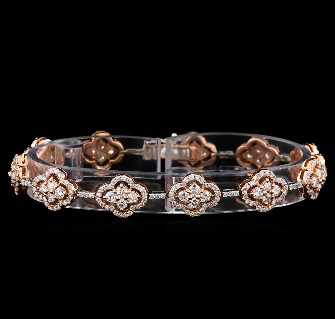 One electronically tested 14KT rose and white gold lady's combination cast & assembled fashion bracelet with a tongue clasp with foldover safety with a bright polish finish. The featured lady's bracelet measures 7 inches in length. Identified with markings of "K14". Condition is new, good workmanship. Containing: Forty-Four prong set round brilliant cut diamonds, measuring 2.50 - 2.40 x 1.52mm (depth est.) approximate total weight of 44 Stones = 2.49ct. Graded in the setting. Clarity: SI-1 to SI-2. Color: G - H. Cut Good Two Hundred Ninety-Seven prong set round brilliant cut diamonds, measuring 1.25 - 1.15 x 0.73mm (depth est.) approximate total weight of 297 Stones = 1.90ct. Graded in the setting. Clarity: SI-1 to I-1. Color: G - Good. Total Weight of Diamonds 4.39ct. Total Weight of Bracelet 15.20gm GAS Appraised.