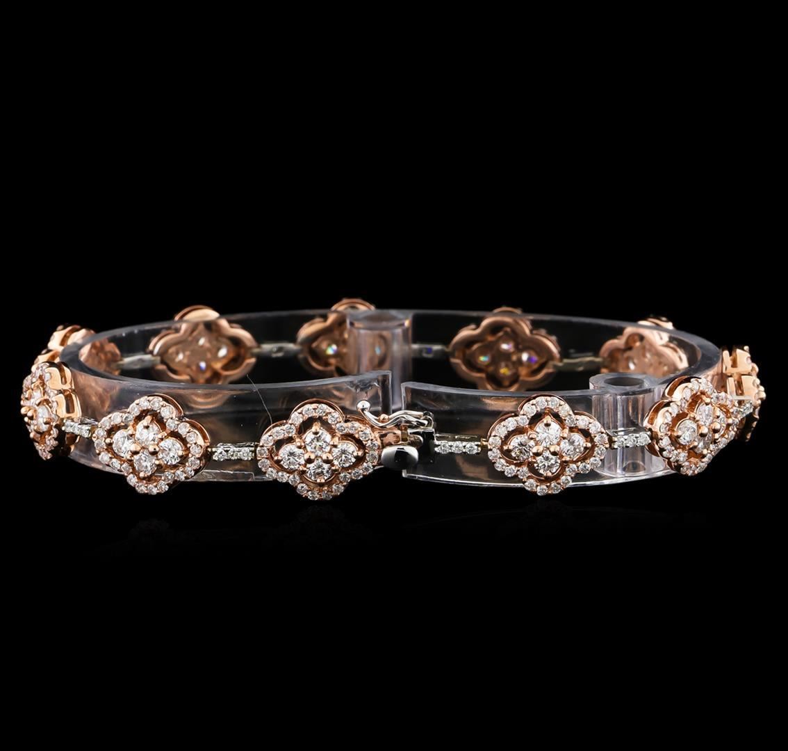 One electronically tested 14KT rose and white gold lady's combination cast & assembled fashion bracelet with a tongue clasp with foldover safety with a bright polish finish. The featured lady's bracelet measures 7 inches in length. Identified with markings of "K14". Condition is new, good workmanship. Containing: Forty-Four prong set round brilliant cut diamonds, measuring 2.50 - 2.40 x 1.52mm (depth est.) approximate total weight of 44 Stones = 2.49ct. Graded in the setting. Clarity: SI-1 to SI-2. Color: G - H. Cut Good Two Hundred Ninety-Seven prong set round brilliant cut diamonds, measuring 1.25 - 1.15 x 0.73mm (depth est.) approximate total weight of 297 Stones = 1.90 ct. Graded in the setting. Clarity: SI-1 to I-1. Color: G - Good. Total Weight of Diamonds 4.39ct. Total Weight of Bracelet 15.20gm GAS Appraised.