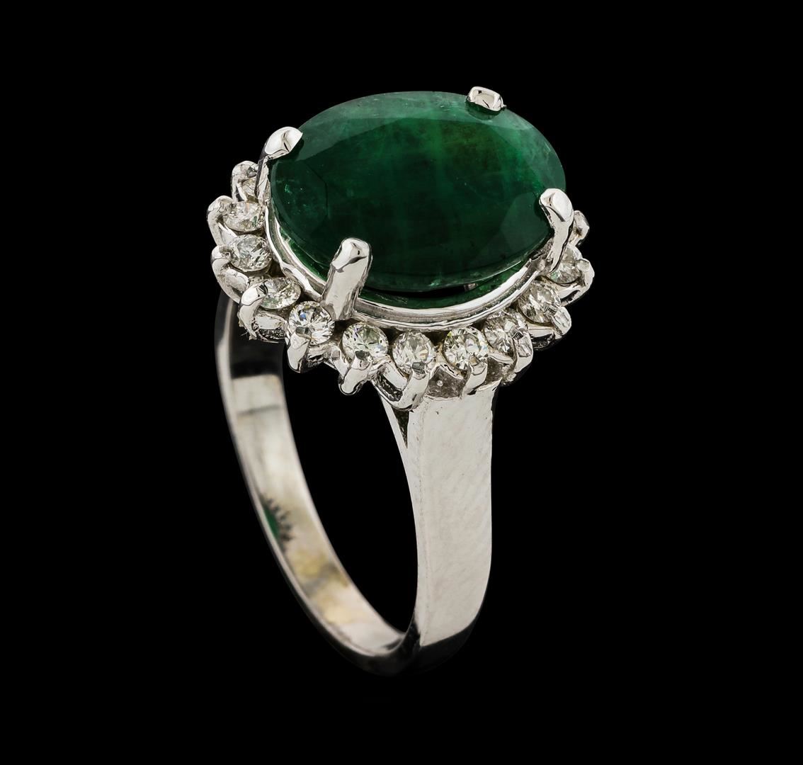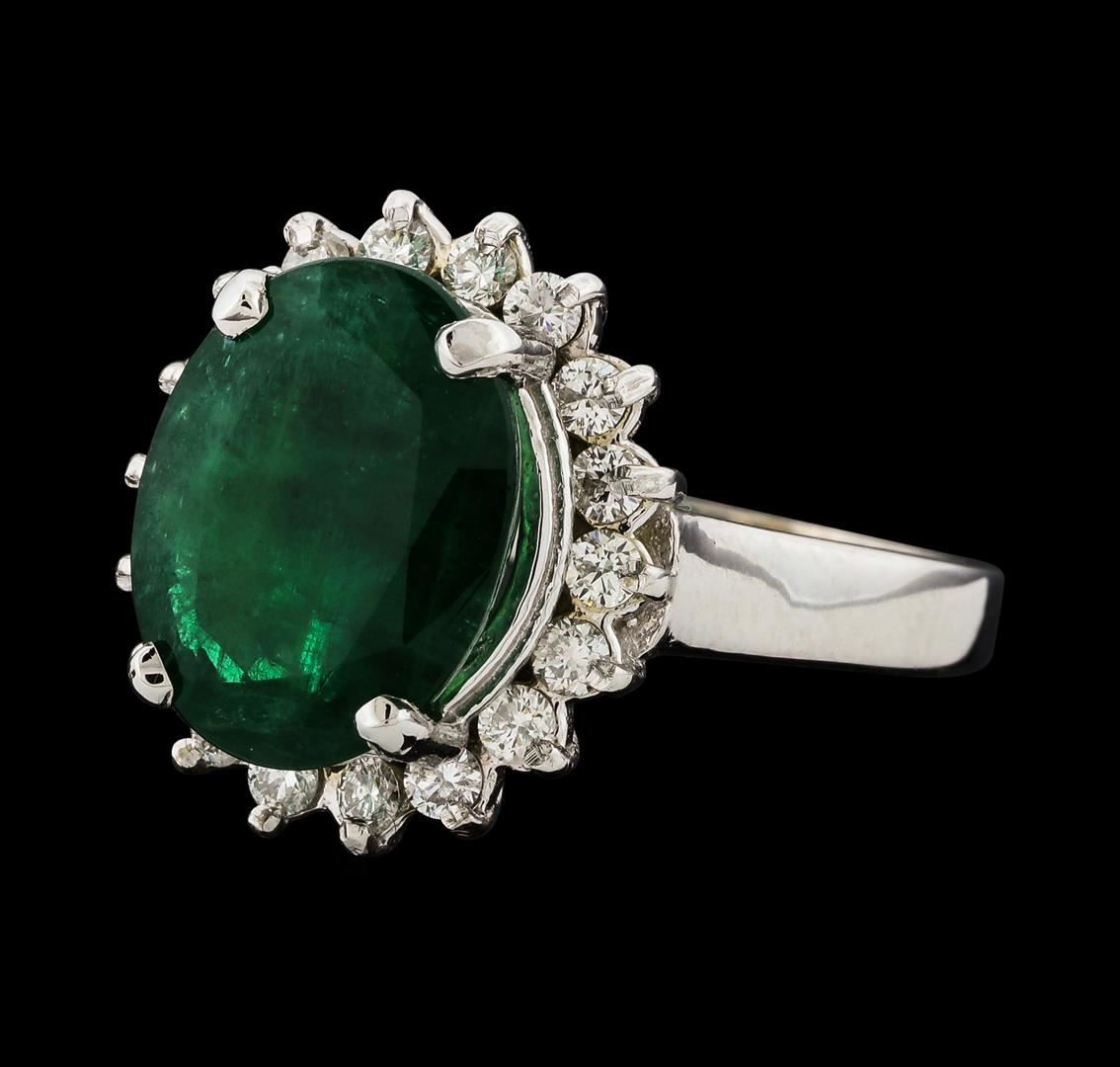One electronically tested 14KT white gold lady's cast fashion ring with a basket halo with a bright polish finish. The featured lady's ring has a shank measuring 2.41 millimeters wide. Identified with markings of '14K'. Condition is new, good workmanship. Containing: One prong set oval modified mixed cut natural emerald, measuring 12.55 x 9.82 x 5.75mm, (depth est.) 8%. bulge factor, approximate weight of 4.39ct., clarity is heavily included, medium dark, moderately strong, green color, (GIA G 6/4), cut is good. Transmitting light somewhat diffusely, semi-transparent to translucent. No indications of clarity enhancement. Indications of oil residue. Colored gemstones are presumed to have been subjected to commonly used enhancement processes. Graded in the setting. Eighteen prong set round brilliant cut diamonds, measuring 2.00 - 1.90 x 1.21mm (depth est.) approximate total weight of 18 Stones = 0.50ct. Graded in the setting. Clarity SI-1 to SI-2. Color: G - H Cut Good. Total Weight of Colored Stones 4.39ct.. Total Weight of Diamonds 0.50ct.. Total Weight of Ring 6.40gm GAS Appraised at $5,840.00.