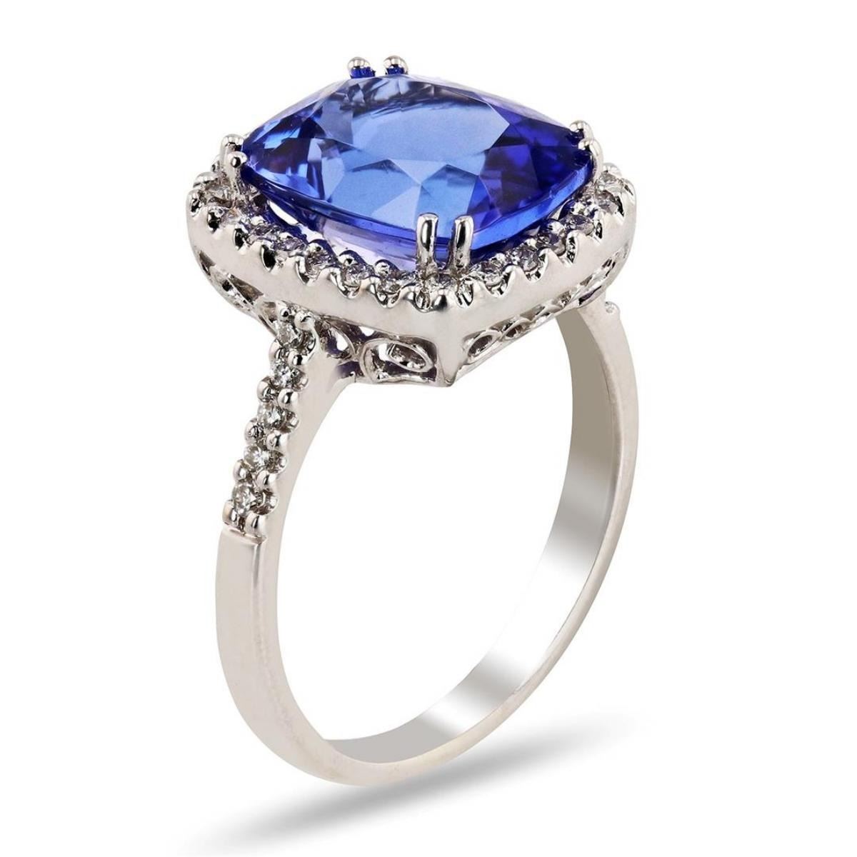 DESCRIPTION: ONE STAMPED 18K WHITE GOLD LADIES CUSTOM MADE DIAMOND & TANZANITE RING . 4.50 GR TW. CONTAINING: I - MAIN CENTER GEMSTONE(S) IDENTITY : ONE CENTER NATURAL TANZANITE SET IN 4 PRONGS SETTING . CARAT WEIGHT : 4.39CTW. SHAPE & MEASUREMEMT : CUSHION CUT. APPROX : 11.00 X 9.00 MM. QUALITY : FINE MEDIUM BLUE/PURPLE , FINE CUT & CLARITY . 2 - ADJACENT GEMSTONES: IDENTITY : NATURAL DIAMONDS. SHAPE : ROUND BRILLIANT CUT. CARAT WEIGHT : 0.29 CT. QUALITY : G/H COLOR , SI1 CLARITY. ALL FINE CUTTING AND PROPORTIONS ALL PRONGS SETTINGS STYLE. TOTAL GEMSTONES WEIGHT : 4.68 CTW TW.