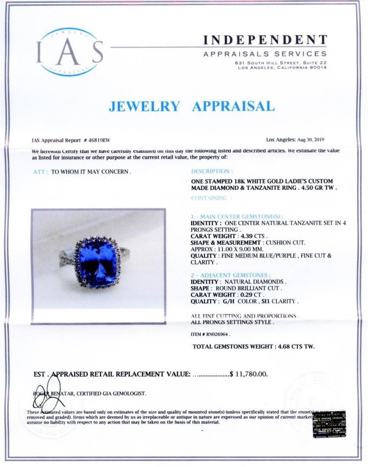 DESCRIPTION: ONE STAMPED 18K WHITE GOLD LADIES CUSTOM MADE DIAMOND & TANZANITE RING . 4.50 GR TW. CONTAINING: I - MAIN CENTER GEMSTONE(S) IDENTITY : ONE CENTER NATURAL TANZANITE SET IN 4 PRONGS SETTING . CARAT WEIGHT : 4.39CTW. SHAPE & MEASUREMEMT : CUSHION CUT. APPROX : 11.00 X 9.00 MM. QUALITY : FINE MEDIUM BLUE/PURPLE , FINE CUT & CLARITY . 2 - ADJACENT GEMSTONES: IDENTITY : NATURAL DIAMONDS. SHAPE : ROUND BRILLIANT CUT. CARAT WEIGHT : 0.29 CT. QUALITY : G/H COLOR , SI1 CLARITY. ALL FINE CUTTING AND PROPORTIONS ALL PRONGS SETTINGS STYLE. TOTAL GEMSTONES WEIGHT : 4.68 CTW TW.