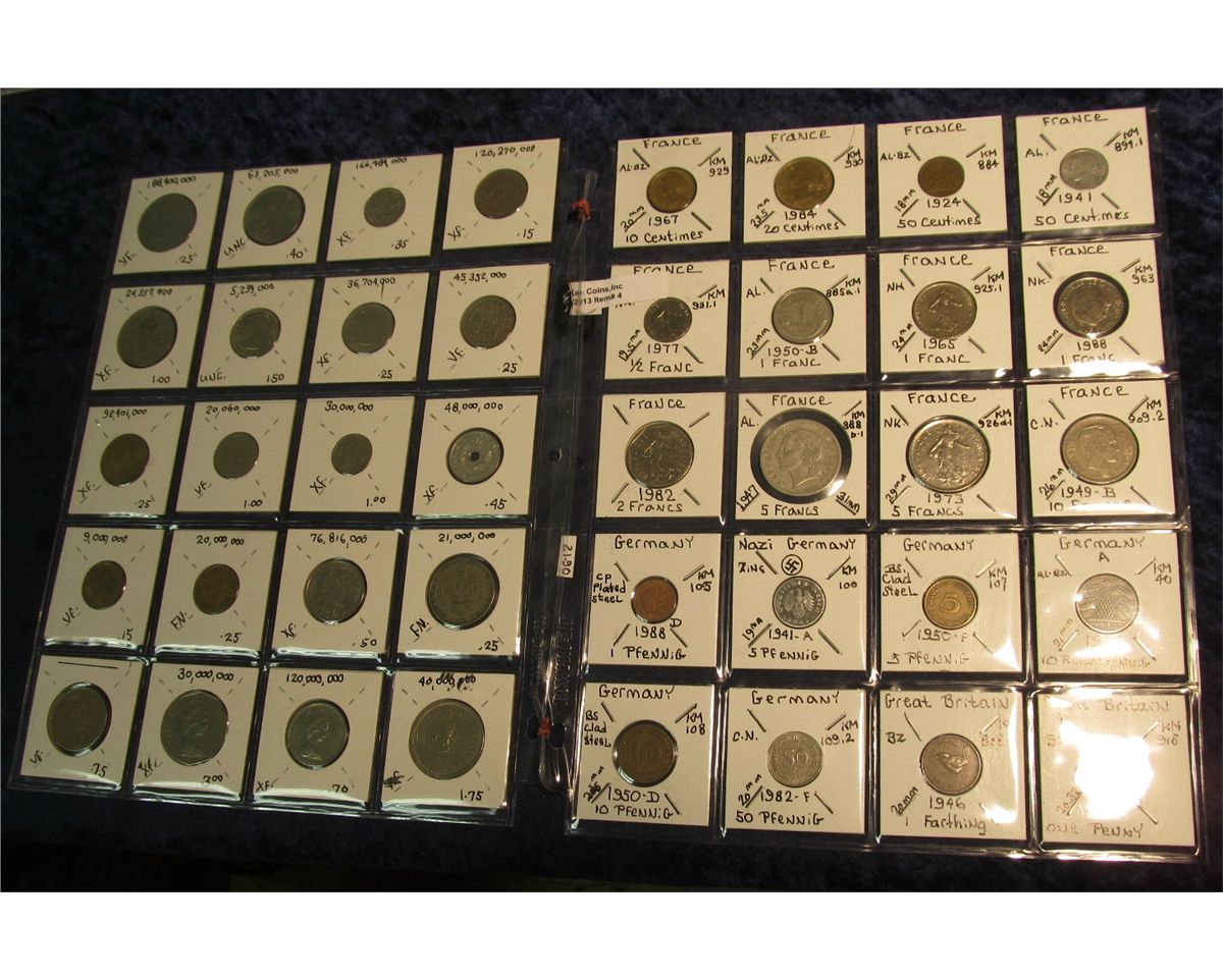4. (40) World Coins in 2" x 2" plastic pages. France through Hong Kong. Total KM catalog value $21.90.