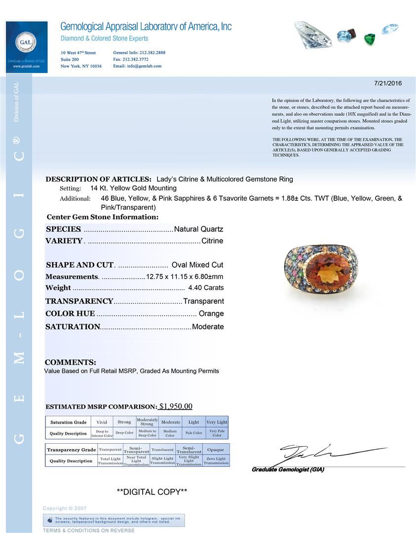 One Lady's Citrine and Multicolored Gemstone Ring. 14 Kt. Yellow Gold Mounting. Additional: 46 Blue, Yellow, and Pink Sapphires and 6 Tsavorite Garnets = 1.88 Cts TWT (Blue, Yellow, Green, and Pink/Transparent). Species: Natural Quartz. Variety: Citrine. Shape and Cut: Oval Mixed Cut. Measurements: 12.75 x 11.15 x 6.80 mm. Weight: 4.40 Carats. Transparency: Transparent. Color Hue: Orange. Saturation: Moderate. Total Weight: 5.23 grams.