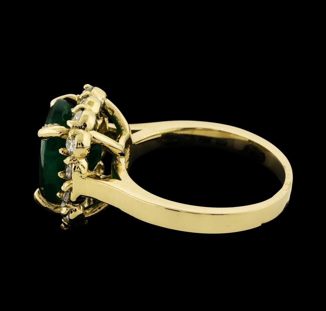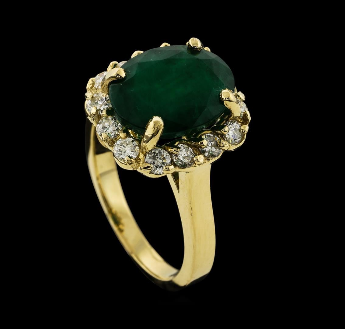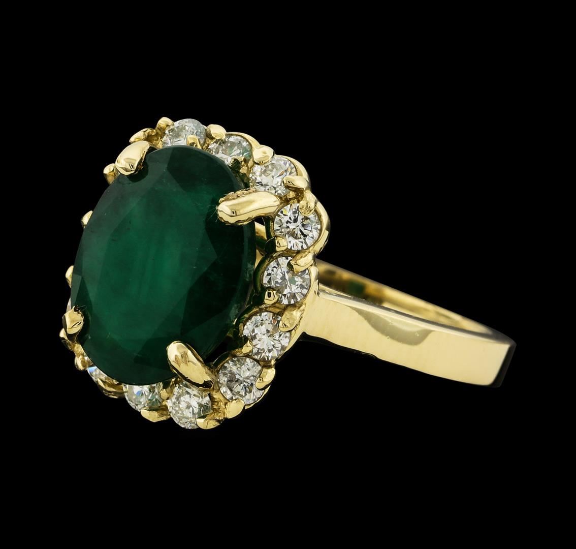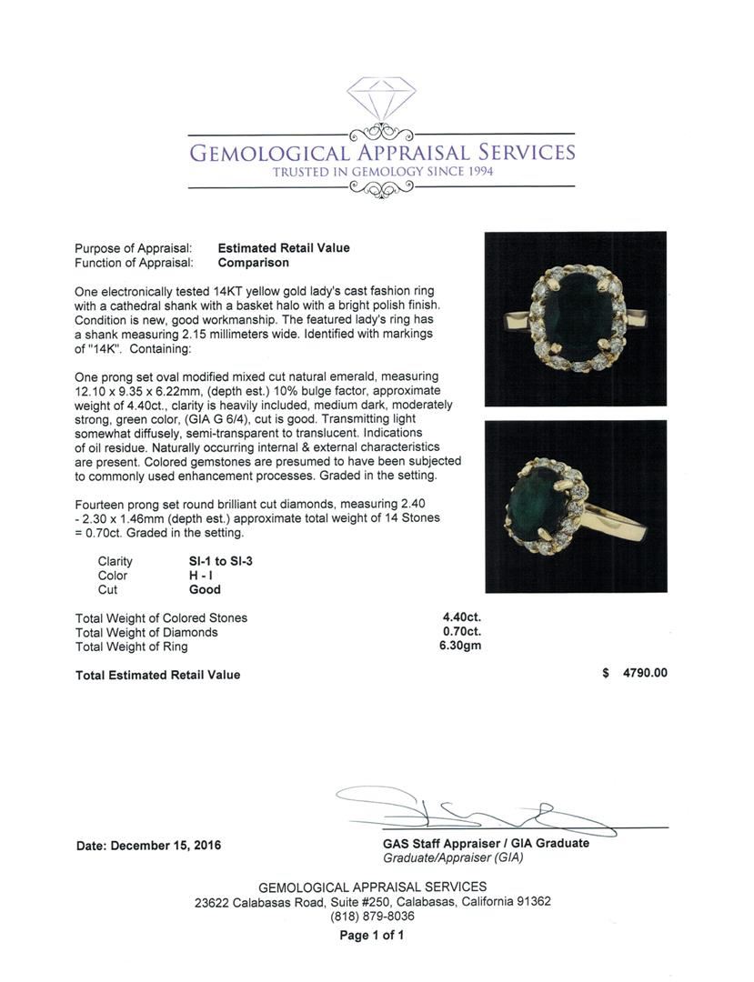 One electronically tested 14KT yellow gold lady's cast fashion ring with a cathedral shank with a basket halo with a bright polish finish. The featured lady's ring has a shank measuring 2.15 millimeters wide. Identified with markings of '14K'. Condition is new, good workmanship. Containing: One prong set oval modified mixed cut natural emerald, measuring 12.10 x 9.35 x 6.22mm, (depth est.) 10%. bulge factor, approximate weight of 4.40ct., clarity is heavily included, medium dark, moderately strong, green color, (GIA G 6/4), cut is good. Transmitting light somewhat diffusely, semi-transparent to translucent. Indications of oil residue. Naturally occurring internal & external characteristics are present. Colored gemstones are presumed to have been subjected to commonly used enhancement processes. Graded in the setting. Fourteen prong set round brilliant cut diamonds, measuring 2.40 - 2.30 x 1.46mm (depth est.) approximate total weight of 14 Stones = 0.70ct. Graded in the setting. Clarity SI-1 to SI-3. Color: H - I Cut Good. Total Weight of Colored Stones 4.40ct.. Total Weight of Diamonds 0.70ct.. Total Weight of Ring 6.30gm. GAS Appraised at $4,790.00.