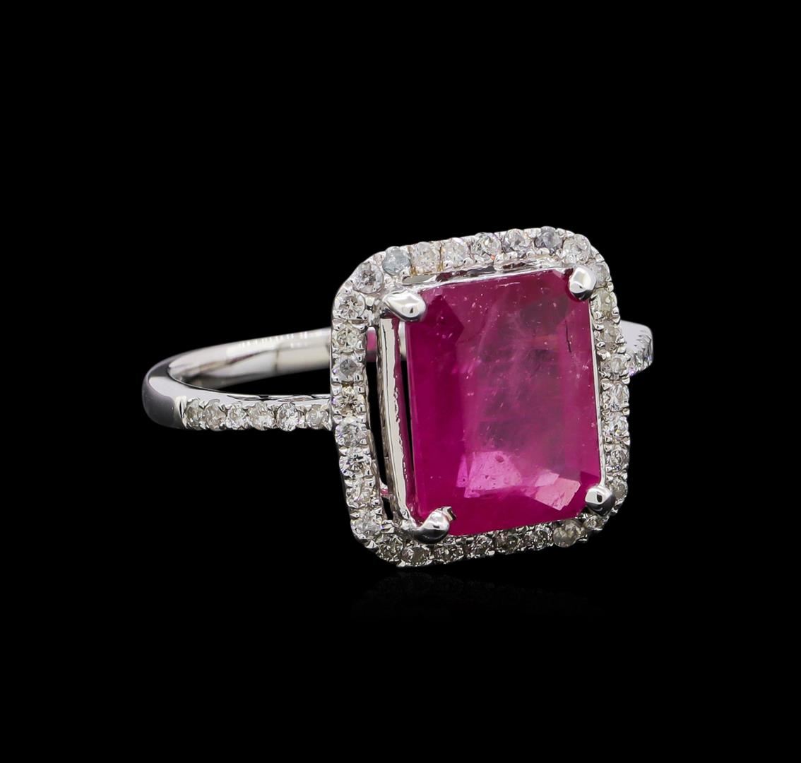 One electronically tested 14KT white gold ladies cast ruby and diamond ring with a bright polish finish. The featured ruby is set within a diamond bezel supported by diamond set shoulders, completed by a one and one-half millimeter wide band. Trademark is Orianne. Identified with markings of "14K". Condition is new, good workmanship. Containing: One prong set rectangular step cut natural ruby, measuring 9.85 x 7.60 x 4.70mm, 5%. bulge factor, approximate weight of 4.40ct., clarity is heavily included, type II, medium dark, very slightly brownish, red color, (GIA R 6/3), cut is good. Transmitting light somewhat diffusely, transparent to translucent. Naturally occurring internal & external characteristics are present. Indications of laboratory high temperature heat treatment, with glass & flux additives. Graded in the setting. Ruby has a low tolerance to rhodium plating, repolishing the surface, & ultrasonic cleaning. Forty-Four prong set round brilliant cut diamonds approximate total weight of 44 Stones = 0.33ct. Graded in the setting. Clarity: I-1 to I-2. Color: H - J. Total Weight of Colored Stones 4.40ct. Total Weight of Diamonds 0.33ct. Total Weight of Ring 3.81gm. AIG Appraised at $2,290.00.