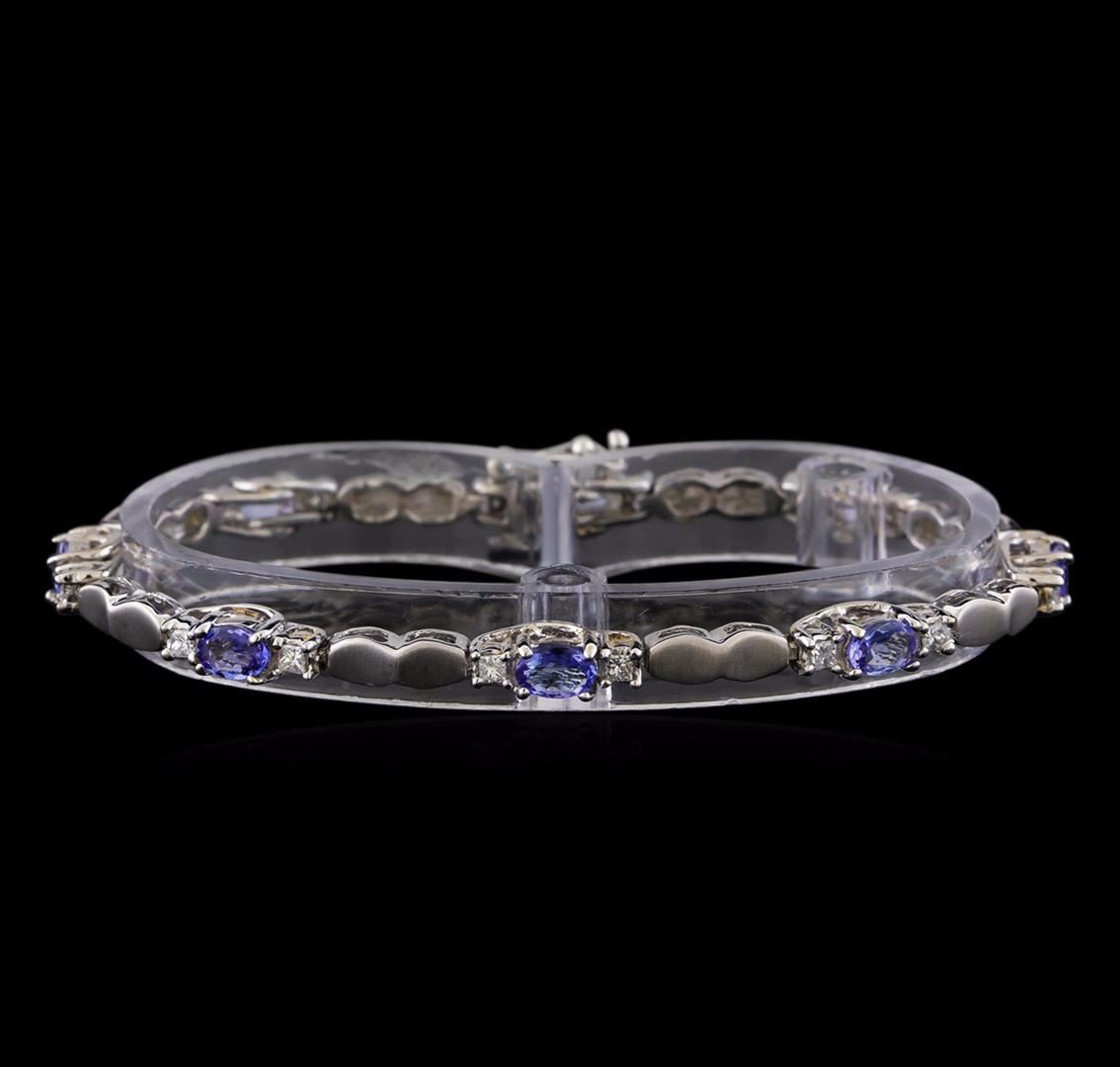 One 14K white gold bracelet 7 inches. 15.52 GR. Containing: Main gemstones: Identity: Tanzanite. Carat weight: 4.40 CTS TW. 8 PCS. Shape and measurement: Oval shape. Quality: Good medium color. Adjacent gemstones: Identity: natural diamond. Shape: Princess cut diamonds. 16 PCS. Carat weight: 1.50 CTS TW. Quality: SI clarity, G-H color. All fine cutting and proportions. Total gemstones weight: 5.90 CTS TW. RBGS Appraised at $5,600.00.