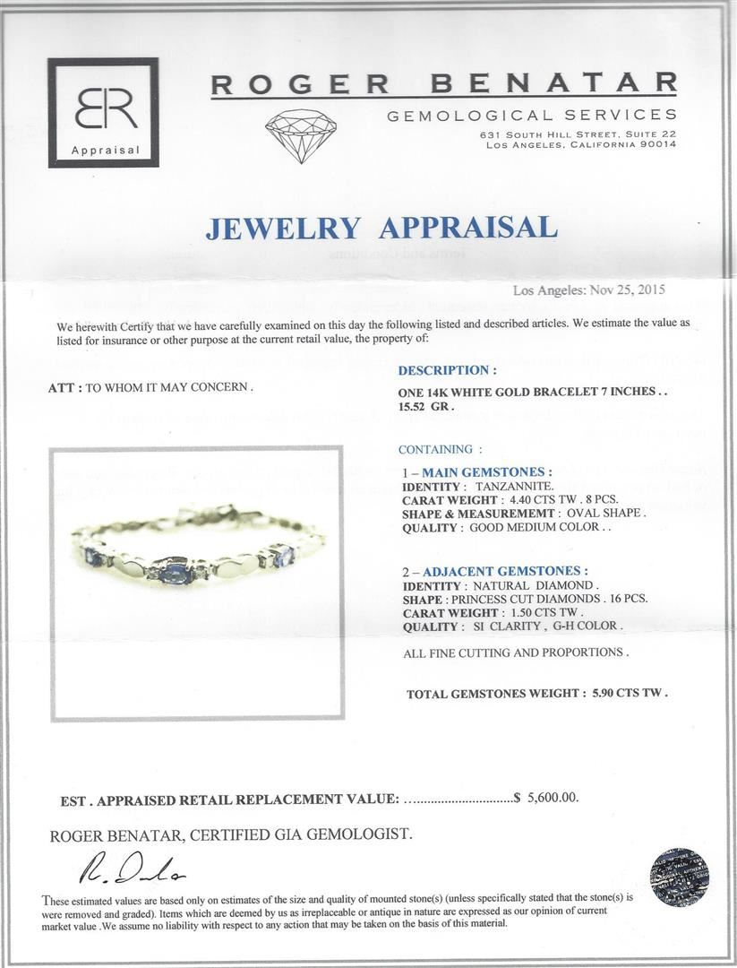 One 14K white gold bracelet 7 inches. 15.52 GR. Containing: Main gemstones: Identity: Tanzanite. Carat weight: 4.40 CTS TW. 8 PCS. Shape and measurement: Oval shape. Quality: Good medium color. Adjacent gemstones: Identity: natural diamond. Shape: Princess cut diamonds. 16 PCS. Carat weight: 1.50 CTS TW. Quality: SI clarity, G-H color. All fine cutting and proportions. Total gemstones weight: 5.90 CTS TW. RBGS Appraised at $5,600.00.