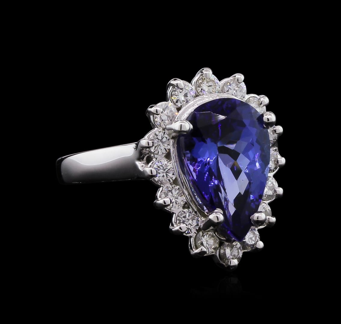 One electronically tested 14KT white gold lady's cast fashion ring with a basket halo with a bright polish finish. The featured lady's ring has a shank measuring 2.27 millimeters wide. Identified with markings of "14K". Condition is new, good workmanship. Containing: One prong set pear modified brilliant cut natural tanzanite, measuring 13.18 x 8.72 x 6.23mm, approximate weight of 4.40ct., clarity is eye clean, type I, medium dark, slightly grayish, violetish blue color, (GIA vB 6/2), cut is very good. Transmitting light with no distortion, transparent. Colored gemstones are presumed to have been subjected to commonly used enhancement processes. Graded in the setting. Sixteen prong set round brilliant cut diamonds, measuring 2.40 - 2.30 x 1.41mm (depth est.) approximate total weight of 16 Stones = 0.70ct. Graded in the setting. Clarity: SI-1 to SI-2. Color: I - Good. Total Weight of Colored Stones 4.40ct. Total Weight of Diamonds 0.70ct. Total Weight of Ring 6.60gm. GAS Appraised at $9,345.00.