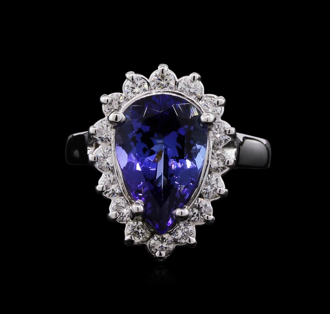 One electronically tested 14KT white gold lady's cast fashion ring with a basket halo with a bright polish finish. The featured lady's ring has a shank measuring 2.27 millimeters wide. Identified with markings of "14K". Condition is new, good workmanship. Containing: One prong set pear modified brilliant cut natural tanzanite, measuring 13.18 x 8.72 x 6.23mm, approximate weight of 4.40ct., clarity is eye clean, type I, medium dark, slightly grayish, violetish blue color, (GIA vB 6/2), cut is very good. Transmitting light with no distortion, transparent. Colored gemstones are presumed to have been subjected to commonly used enhancement processes. Graded in the setting. Sixteen prong set round brilliant cut diamonds, measuring 2.40 - 2.30 x 1.41mm (depth est.) approximate total weight of 16 Stones = 0.70ct. Graded in the setting. Clarity: SI-1 to SI-2. Color: I - Good. Total Weight of Colored Stones 4.40ct. Total Weight of Diamonds 0.70ct. Total Weight of Ring 6.60gm. GAS Appraised at $9,345.00.