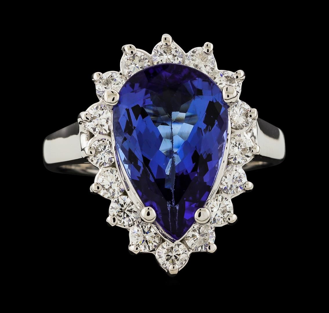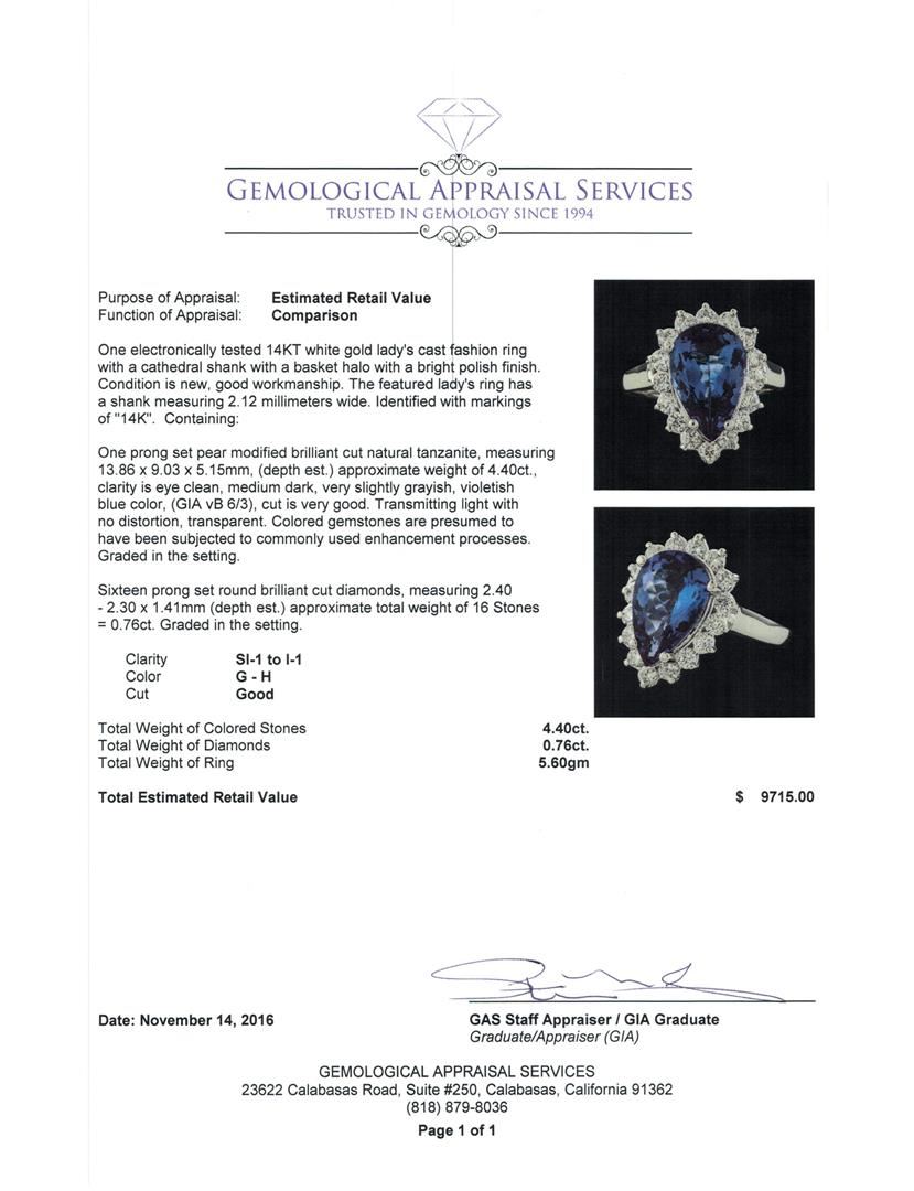 One electronically tested 14KT white gold lady's cast fashion ring with a cathedral shank with a basket halo with a bright polish finish. The featured lady's ring has a shank measuring 2.12 millimeters wide. Identified with markings of '14K'. Condition is new, good workmanship. Containing: One prong set pear modified brilliant cut natural tanzanite, measuring 13.86 x 9.03 x 5.15mm, (depth est.) approximate weight of 4.40ct., clarity is eye clean, medium dark, very slightly grayish, violetish blue color, (GIA vB 6/3), cut is very good. Transmitting light with no distortion, transparent. Colored gemstones are presumed to have been subjected to commonly used enhancement processes. Graded in the setting. Sixteen prong set round brilliant cut diamonds, measuring 2.40 - 2.30 x 1.41mm (depth est.) approximate total weight of 16 Stones = 0.76ct. Graded in the setting. Clarity SI-1 to I-1. Color: G - H Cut Good. Total Weight of Colored Stones 4.40ct.. Total Weight of Diamonds 0.76ct.. Total Weight of Ring 5.60gm GAS Appraised at $9,715.00.