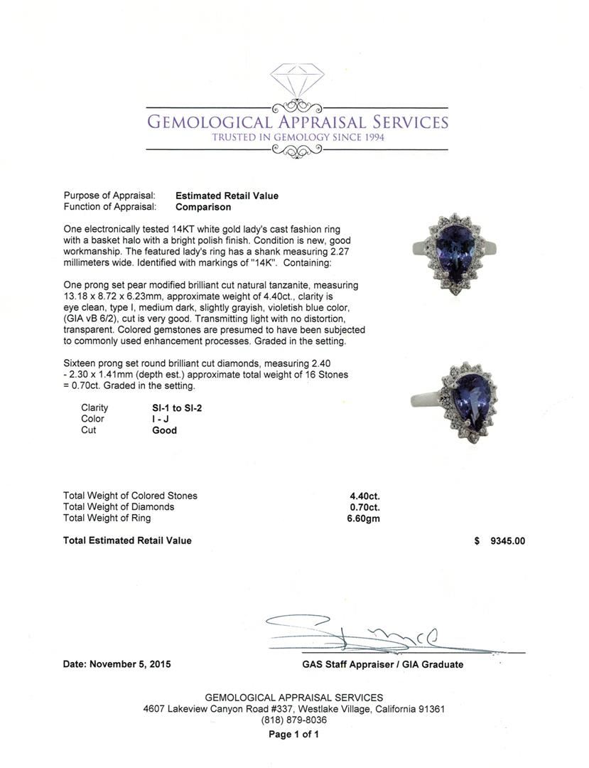 One electronically tested 14KT white gold lady's cast fashion ring with a basket halo with a bright polish finish. The featured lady's ring has a shank measuring 2.27 millimeters wide. Identified with markings of "14K". Condition is new, good workmanship. Containing: One prong set pear modified brilliant cut natural tanzanite, measuring 13.18 x 8.72 x 6.23mm, approximate weight of 4.40ct., clarity is eye clean, type I, medium dark, slightly grayish, violetish blue color, (GIA vB 6/2), cut is very good. Transmitting light with no distortion, transparent. Colored gemstones are presumed to have been subjected to commonly used enhancement processes. Graded in the setting. Sixteen prong set round brilliant cut diamonds, measuring 2.40 - 2.30 x 1.41mm (depth est.) approximate total weight of 16 Stones = 0.70ct. Graded in the setting. Clarity: SI-1 to SI-2. Color: I - Good. Total Weight of Colored Stones 4.40ct. Total Weight of Diamonds 0.70ct. Total Weight of Ring 6.60gm. GAS Appraised at $9,345.00.