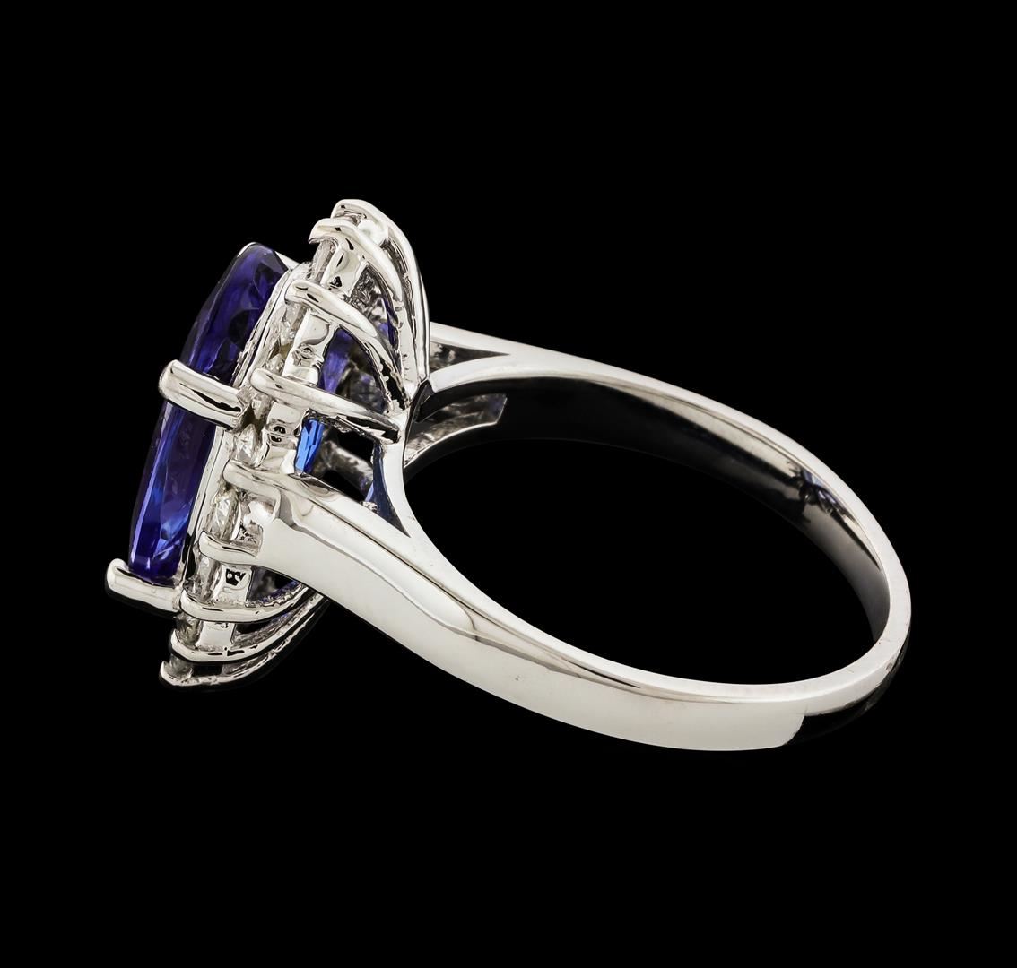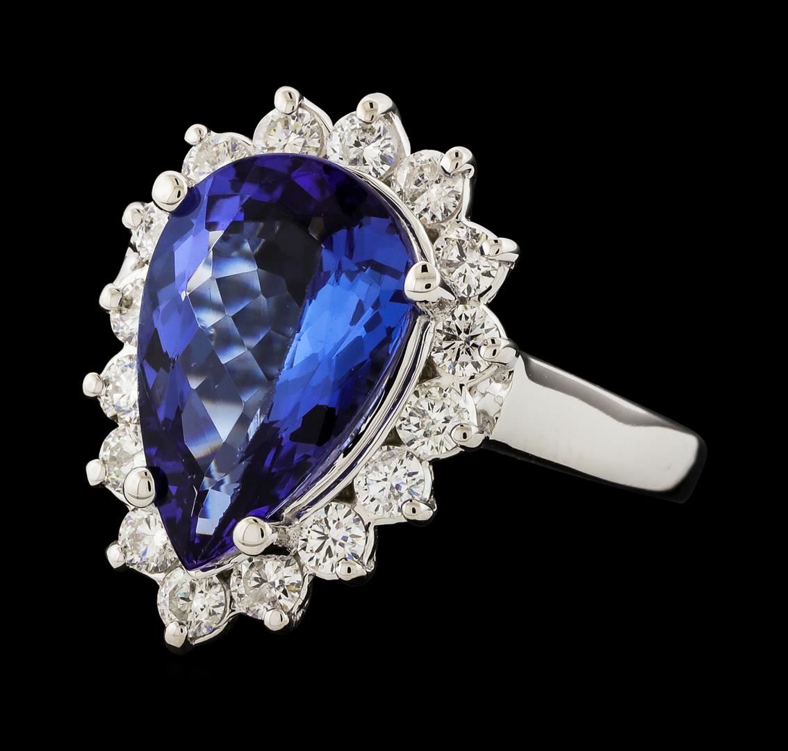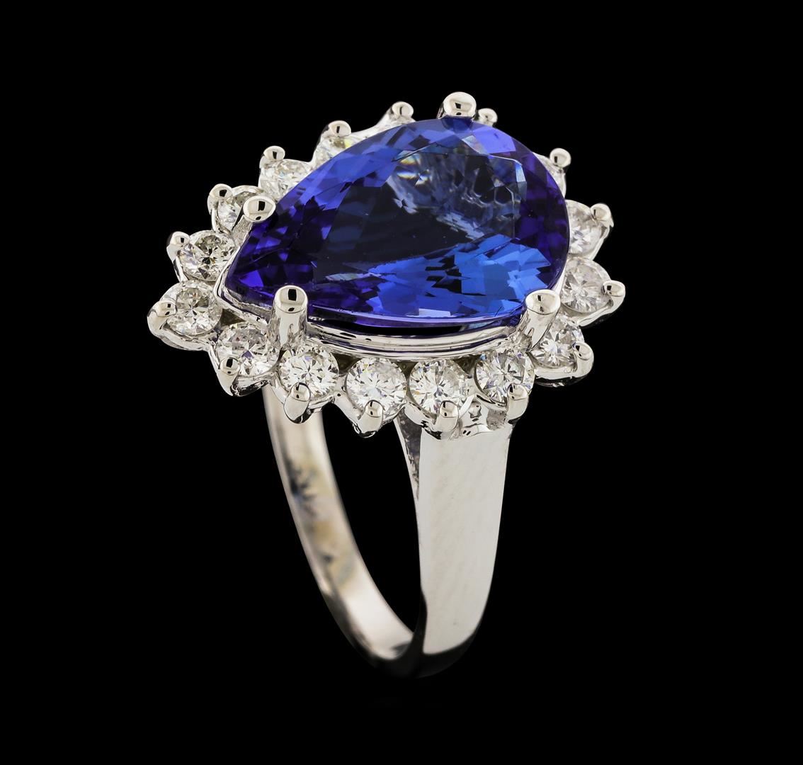 One electronically tested 14KT white gold lady's cast fashion ring with a cathedral shank with a basket halo with a bright polish finish. The featured lady's ring has a shank measuring 2.12 millimeters wide. Identified with markings of '14K'. Condition is new, good workmanship. Containing: One prong set pear modified brilliant cut natural tanzanite, measuring 13.86 x 9.03 x 5.15mm, (depth est.) approximate weight of 4.40ct., clarity is eye clean, medium dark, very slightly grayish, violetish blue color, (GIA vB 6/3), cut is very good. Transmitting light with no distortion, transparent. Colored gemstones are presumed to have been subjected to commonly used enhancement processes. Graded in the setting. Sixteen prong set round brilliant cut diamonds, measuring 2.40 - 2.30 x 1.41mm (depth est.) approximate total weight of 16 Stones = 0.76ct. Graded in the setting. Clarity SI-1 to I-1. Color: G - H Cut Good. Total Weight of Colored Stones 4.40ct.. Total Weight of Diamonds 0.76ct.. Total Weight of Ring 5.60gm GAS Appraised at $9,715.00.