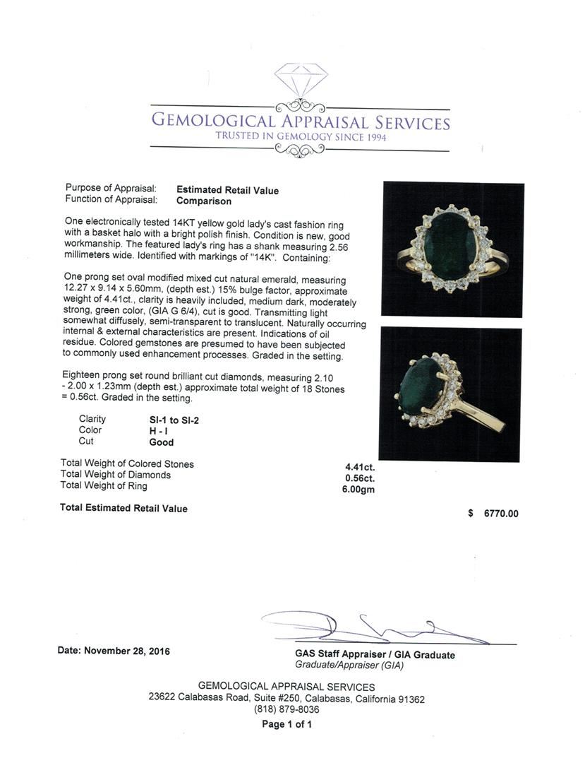 One electronically tested 14KT yellow gold lady's cast fashion ring with a basket halo with a bright polish finish. The featured lady's ring has a shank measuring 2.56 millimeters wide. Identified with markings of '14K'. Condition is new, good workmanship. Containing: One prong set oval modified mixed cut natural emerald, measuring 12.27 x 9.14 x 5.60mm, (depth est.) 15%. bulge factor, approximate weight of 4.41ct., clarity is heavily included, medium dark, moderately strong, green color, (GIA G 6/4), cut is good. Transmitting light somewhat diffusely, semi-transparent to translucent. Naturally occurring internal & external characteristics are present. Indications of oil residue. Colored gemstones are presumed to have been subjected to commonly used enhancement processes. Graded in the setting. Eighteen prong set round brilliant cut diamonds, measuring 2.10 - 2.00 x 1.23mm (depth est.) approximate total weight of 18 Stones = 0.56ct. Graded in the setting. Clarity SI-1 to SI-2. Color: H - I Cut Good. Total Weight of Colored Stones 4.41ct.. Total Weight of Diamonds 0.56ct.. Total Weight of Ring 6.00gm. GAS Appraised at $6,770.00.