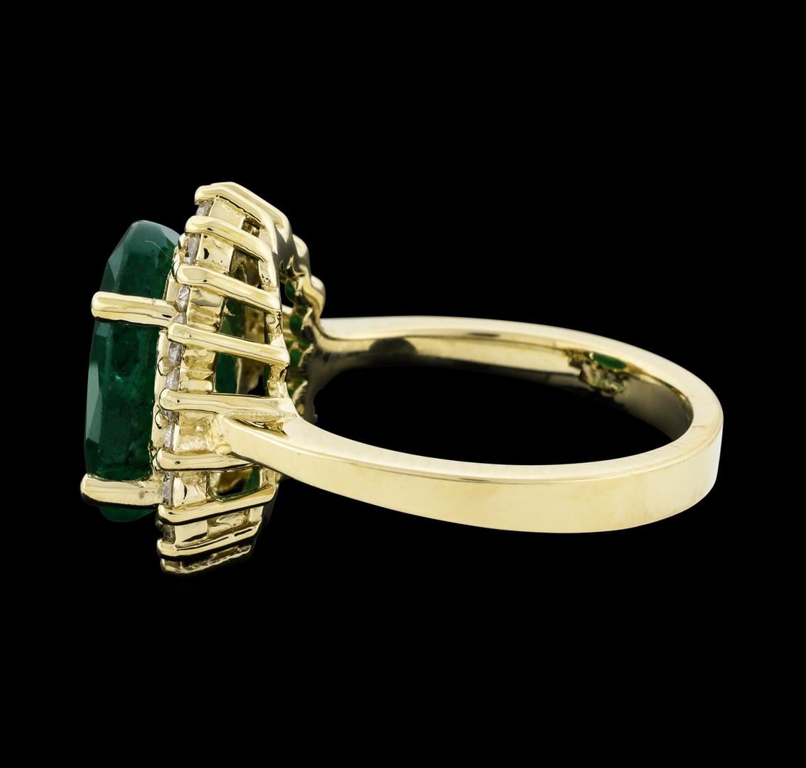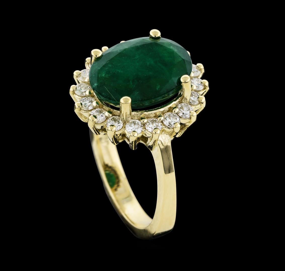 One electronically tested 14KT yellow gold lady's cast fashion ring with a basket halo with a bright polish finish. The featured lady's ring has a shank measuring 2.56 millimeters wide. Identified with markings of '14K'. Condition is new, good workmanship. Containing: One prong set oval modified mixed cut natural emerald, measuring 12.27 x 9.14 x 5.60mm, (depth est.) 15%. bulge factor, approximate weight of 4.41ct., clarity is heavily included, medium dark, moderately strong, green color, (GIA G 6/4), cut is good. Transmitting light somewhat diffusely, semi-transparent to translucent. Naturally occurring internal & external characteristics are present. Indications of oil residue. Colored gemstones are presumed to have been subjected to commonly used enhancement processes. Graded in the setting. Eighteen prong set round brilliant cut diamonds, measuring 2.10 - 2.00 x 1.23mm (depth est.) approximate total weight of 18 Stones = 0.56ct. Graded in the setting. Clarity SI-1 to SI-2. Color: H - I Cut Good. Total Weight of Colored Stones 4.41ct.. Total Weight of Diamonds 0.56ct.. Total Weight of Ring 6.00gm. GAS Appraised at $6,770.00.