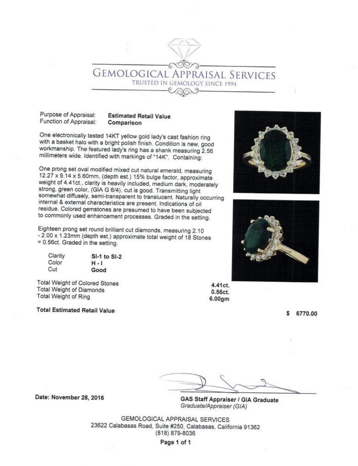 One electronically tested 14KT yellow gold lady's cast fashion ring with a basket halo with a bright polish finish. The featured lady's ring has a shank measuring 2.56 millimeters wide. Identified with markings of '14K'. Condition is new, good workmanship. Containing: One prong set oval modified mixed cut natural emerald, measuring 12.27 x 9.14 x 5.60mm, (depth est.) 15%. bulge factor, approximate weight of 4.41ct., clarity is heavily included, medium dark, moderately strong, green color, (GIA G 6/4), cut is good. Transmitting light somewhat diffusely, semi-transparent to translucent. Naturally occurring internal & external characteristics are present. Indications of oil residue. Colored gemstones are presumed to have been subjected to commonly used enhancement processes. Graded in the setting. Eighteen prong set round brilliant cut diamonds, measuring 2.10 - 2.00 x 1.23mm (depth est.) approximate total weight of 18 Stones = 0.56ct. Graded in the setting. Clarity SI-1 to SI-2. Color: H - I Cut Good. Total Weight of Colored Stones 4.41ct.. Total Weight of Diamonds 0.56ct.. Total Weight of Ring 6.00gm. GAS Appraised.
