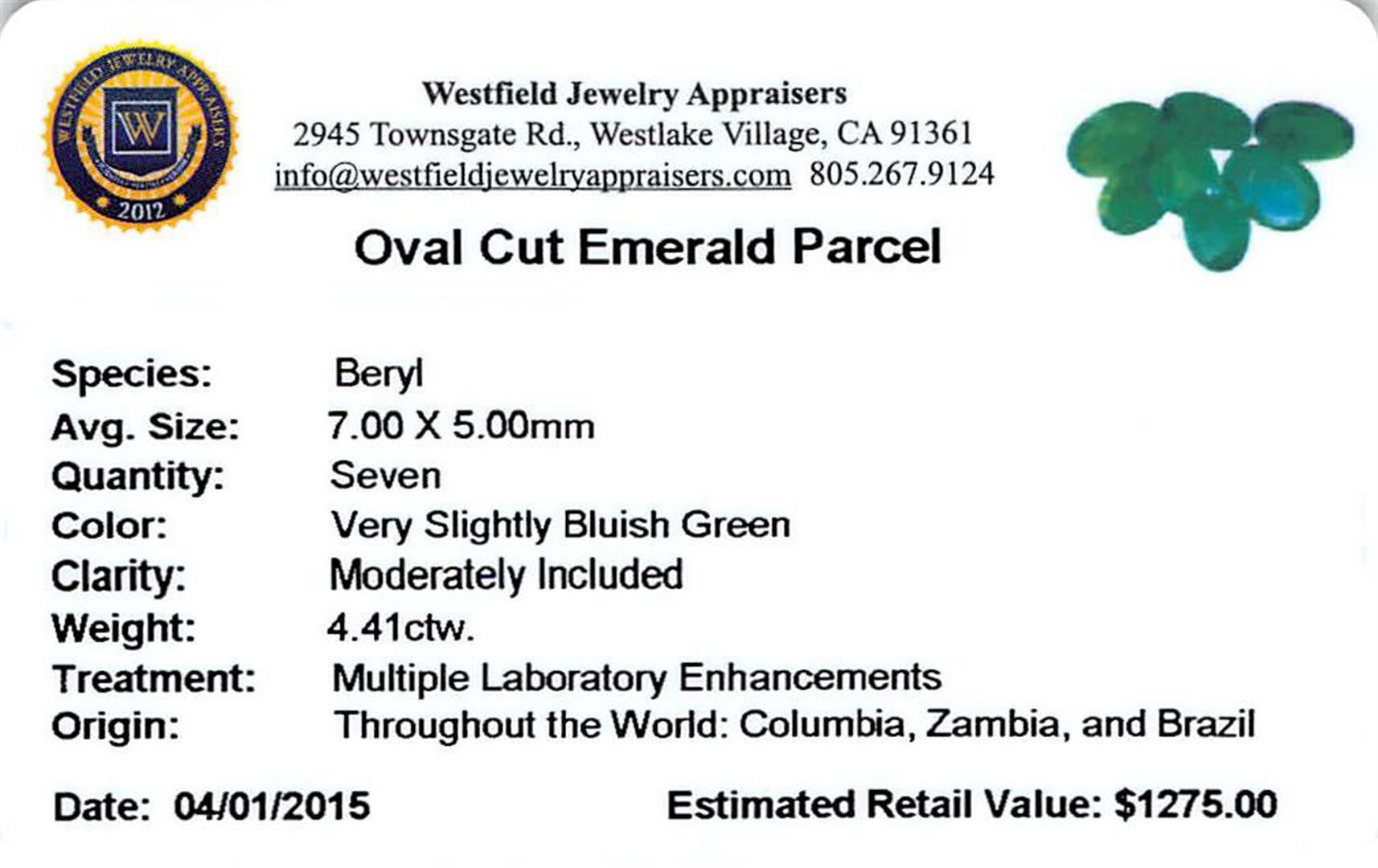 Seven oval mixed cut natural emeralds exact total weight 4.41ct., clarity is moderately included, type III, medium dark, very slightly grayish, very slightly bluish green color, (GIA vslbG 6/3), cut is good. Westfield Appraised at $1,275.00.