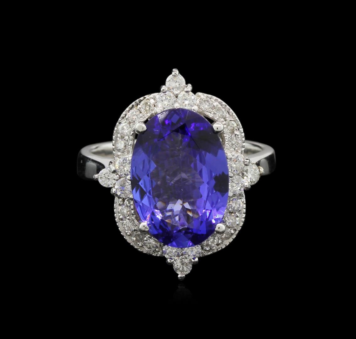 One electronically tested 14KT white gold ladies cast tanzanite and diamond ring. The featured tanzanite is set within an elaborate diamond set bezel, completed by a three millimeter wide band. Bright polish finish with milgrain detailing. Identified with markings of "K14". Condition is new, good workmanship. Containing: One prong set oval mixed cut natural tanzanite, measuring 13.25 x 9.25 x 4.15mm, 20% bulge factor, exact weight 4.41ct., clarity is eye clean, type I, dark, very slightly grayish, bluish violet color, (GIA bV 7/3), cut is good. Transmitting light with no distortion, transparent. Graded in the setting. Tanzanite is a very rare gemstone that is only found in the country of Tanzania. Originally discovered in 1967. Tiffany & Company, named the stone Tanzanite. It is found in the Usumburu Mountains that border the Umba Valley of northern Tanzania. Tanzanite occurs in gray, brown, violet, blue, reddish-purple, & green. The gem is interesting because of its exceptional pleochroism. Rotated in different directions a tanzanite will exhibit multiple changes of color. Tanzanite has a low tolerance to ultrasonic cleaning, and should not be cleaned using this method. Twenty-Eight prong set round brilliant cut diamonds exact total weight 28 Stones = 0.55ct. Graded in the setting. Clarity: SI-2 to I-1. Color: G - I. Total Weight of Colored Stones 4.41ct. Total Weight of Diamonds 0.55ct. Total Weight of Ring 6.92gm. AIG Appraised at $12,260.00.