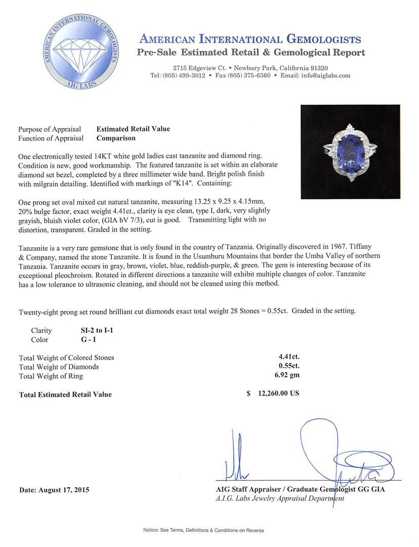 One electronically tested 14KT white gold ladies cast tanzanite and diamond ring. The featured tanzanite is set within an elaborate diamond set bezel, completed by a three millimeter wide band. Bright polish finish with milgrain detailing. Identified with markings of "K14". Condition is new, good workmanship. Containing: One prong set oval mixed cut natural tanzanite, measuring 13.25 x 9.25 x 4.15mm, 20% bulge factor, exact weight 4.41ct., clarity is eye clean, type I, dark, very slightly grayish, bluish violet color, (GIA bV 7/3), cut is good. Transmitting light with no distortion, transparent. Graded in the setting. Tanzanite is a very rare gemstone that is only found in the country of Tanzania. Originally discovered in 1967. Tiffany & Company, named the stone Tanzanite. It is found in the Usumburu Mountains that border the Umba Valley of northern Tanzania. Tanzanite occurs in gray, brown, violet, blue, reddish-purple, & green. The gem is interesting because of its exceptional pleochroism. Rotated in different directions a tanzanite will exhibit multiple changes of color. Tanzanite has a low tolerance to ultrasonic cleaning, and should not be cleaned using this method. Twenty-Eight prong set round brilliant cut diamonds exact total weight 28 Stones = 0.55ct. Graded in the setting. Clarity: SI-2 to I-1. Color: G - I. Total Weight of Colored Stones 4.41ct. Total Weight of Diamonds 0.55ct. Total Weight of Ring 6.92gm. AIG Appraised at $12,260.00.