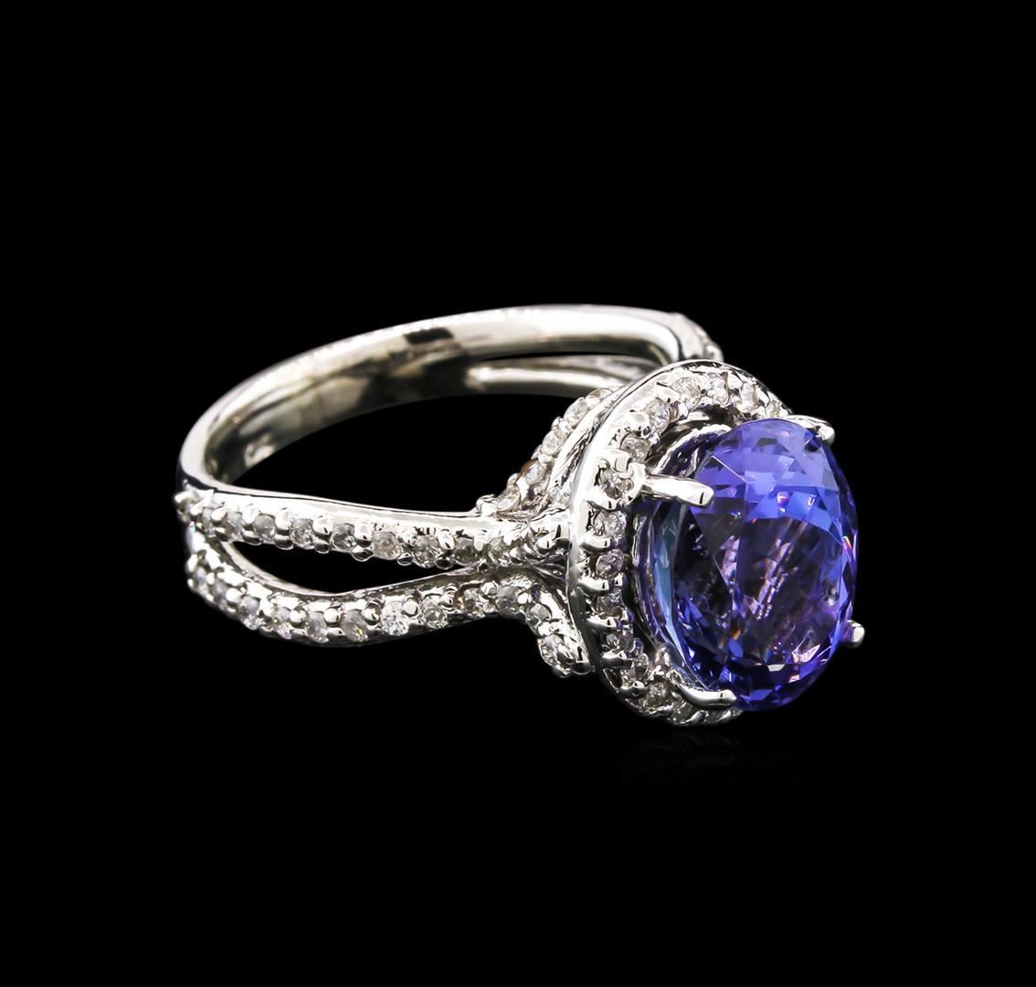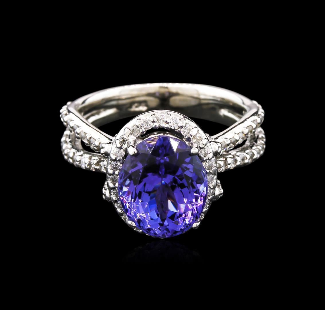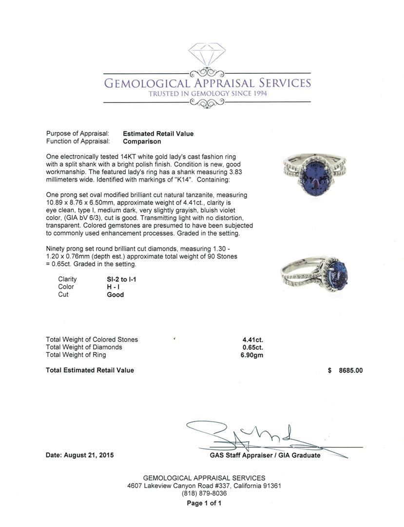 One electronically tested 14KT white gold lady's cast fashion ring with a split shank with a bright polish finish. The featured lady's ring has a shank measuring 3.83 millimeters wide. Identified with markings of "K14". Condition is new, good workmanship. Containing: One prong set oval modified brilliant cut natural tanzanite, measuring 10.89 x 8.76 x 6.50mm, approximate weight of 4.41ct., clarity is eye clean, type I, medium dark, very slightly grayish, bluish violet color, (GIA bV 6/3), cut is good. Transmitting light with no distortion, transparent. Colored gemstones are presumed to have been subjected to commonly used enhancement processes. Graded in the setting. Ninety prong set round brilliant cut diamonds, measuring 1.30 - 1.20 x 0.76mm (depth est.) approximate total weight of 90 Stones = 0.65ct. Graded in the setting. Clarity: SI-2 to I-1. Color: H - I. Cut Good. Total Weight of Colored Stones 4.41ct. Total Weight of Diamonds 0.65ct. Total Weight of Ring 6.90gm. GAS Appraised.