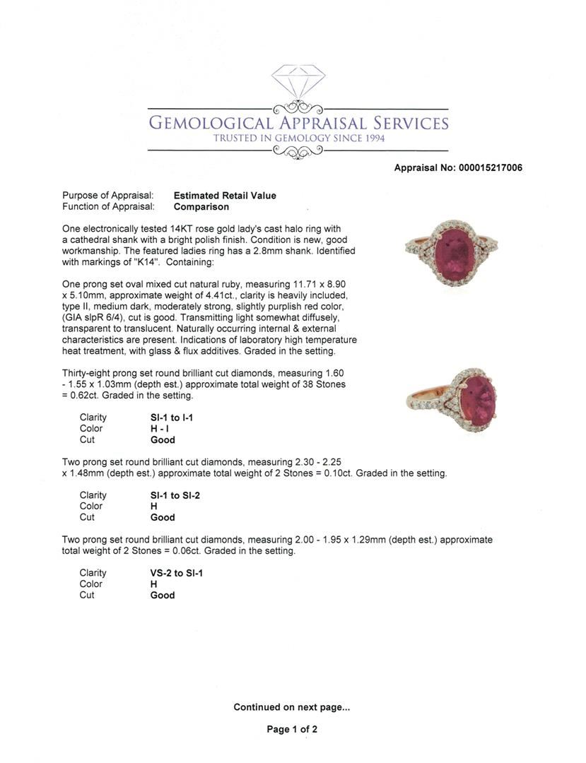 One electronically tested 14KT rose gold lady's cast halo ring with a cathedral shank with a bright polish finish. The featured ladies ring has a 2.8mm shank. Identified with markings of "K14". Condition is new, good workmanship. Containing: One prong set oval mixed cut natural ruby, measuring 11.71 x 8.90 x 5.10mm, approximate weight of 4.41ct., clarity is heavily included, type II, medium dark, moderately strong, slightly purplish red color, (GIA slpR 6/4), cut is good. Transmitting light somewhat diffusely, transparent to translucent. Naturally occurring internal & external characteristics are present. Indications of laboratory high temperature heat treatment, with glass & flux additives. Graded in the setting. Thirty-Eight prong set round brilliant cut diamonds, measuring 1.60 - 1.55 x 1.03mm (depth est.) approximate. Total Weight of 38 Stones = 0.62ct. Graded in the setting. Clarity: SI-1 to I-1. Color: H - I. Cut Good Two prong set round brilliant cut diamonds, measuring 2.30 - 2.25 x 1.48mm (depth est.) approximate. Total Weight of 2 Stones = 0.10ct. Graded in the setting. Clarity: SI-1 to SI-2. Color: H. Cut Good Two prong set round brilliant cut diamonds, measuring 2.00 - 1.95 x 1.29mm (depth est.) approximate. Total Weight of 2 Stones = 0.06ct. Graded in the setting. Clarity: VS-2 to SI-1. Color: Good Two prong set round brilliant cut diamonds, measuring 1.80 - 1.75 x 1.07mm (depth est.) approximate. Total Weight of 2 Stones = 0.04ct. Graded in the setting. Clarity: SI-1 to SI-2. Color: H - I. Cut Good. Total Weight of Colored Stones 4.41ct. Total Weight of Diamonds 0.82ct. Total Weight of Ring 6.40gm. Gemological Appraisal Services at $6,075.00.