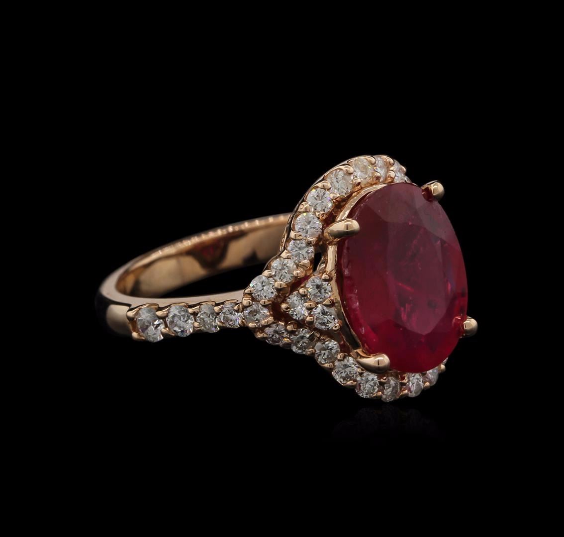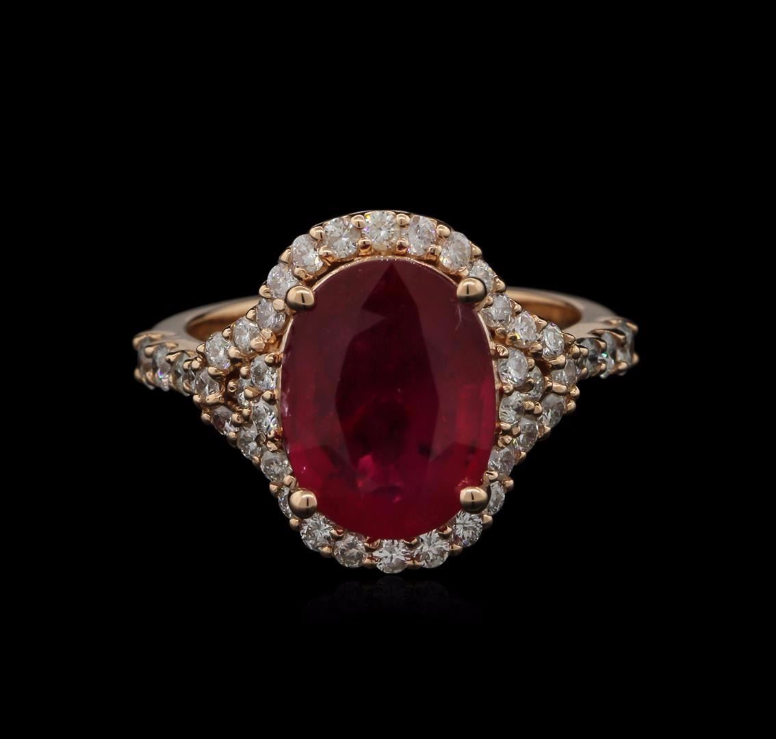 One electronically tested 14KT rose gold lady's cast halo ring with a cathedral shank with a bright polish finish. The featured ladies ring has a 2.8mm shank. Identified with markings of "K14". Condition is new, good workmanship. Containing: One prong set oval mixed cut natural ruby, measuring 11.71 x 8.90 x 5.10mm, approximate weight of 4.41ct., clarity is heavily included, type II, medium dark, moderately strong, slightly purplish red color, (GIA slpR 6/4), cut is good. Transmitting light somewhat diffusely, transparent to translucent. Naturally occurring internal & external characteristics are present. Indications of laboratory high temperature heat treatment, with glass & flux additives. Graded in the setting. Thirty-Eight prong set round brilliant cut diamonds, measuring 1.60 - 1.55 x 1.03mm (depth est.) approximate. Total Weight of 38 Stones = 0.62ct. Graded in the setting. Clarity: SI-1 to I-1. Color: H - I. Cut Good Two prong set round brilliant cut diamonds, measuring 2.30 - 2.25 x 1.48mm (depth est.) approximate. Total Weight of 2 Stones = 0.10ct. Graded in the setting. Clarity: SI-1 to SI-2. Color: H. Cut Good Two prong set round brilliant cut diamonds, measuring 2.00 - 1.95 x 1.29mm (depth est.) approximate. Total Weight of 2 Stones = 0.06ct. Graded in the setting. Clarity: VS-2 to SI-1. Color: Good Two prong set round brilliant cut diamonds, measuring 1.80 - 1.75 x 1.07mm (depth est.) approximate. Total Weight of 2 Stones = 0.04ct. Graded in the setting. Clarity: SI-1 to SI-2. Color: H - I. Cut Good. Total Weight of Colored Stones 4.41ct. Total Weight of Diamonds 0.82ct. Total Weight of Ring 6.40gm. GAS Appraised at $6,075.00.