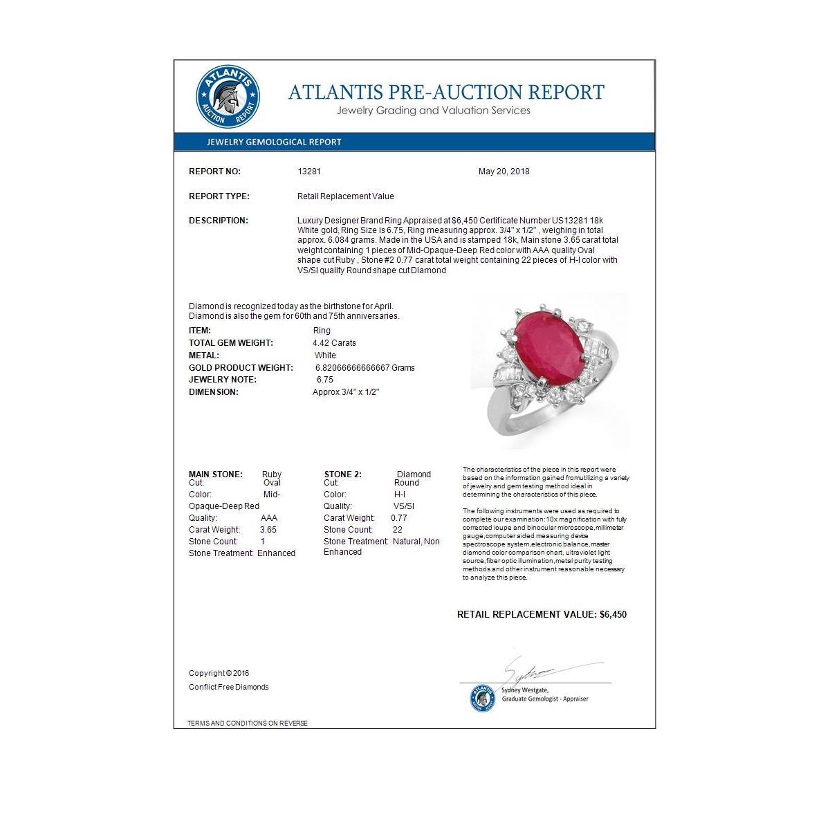 REF-90T5M -13281 ---- 4.42 CTW Ruby & Diamond Ring 18K White Gold ---- Luxury Designer Brand Ring Appraised at $6,450 Certificate Number US13281 18k White gold, Ring Size is 6.75, Ring measuring approx. 3/4" x 1/2" , weighing in total approx. 6.084 grams. Made in the USA and is stamped 18k, Main stone 3.65 carat total weight containing 1 pieces of Mid-Opaque-Deep Red color with AAA quality Oval shape cut Ruby , Stone #2 0.77 carat total weight containing 22 pieces of H-I color with VS/SI quality Round shape cut Diamond
