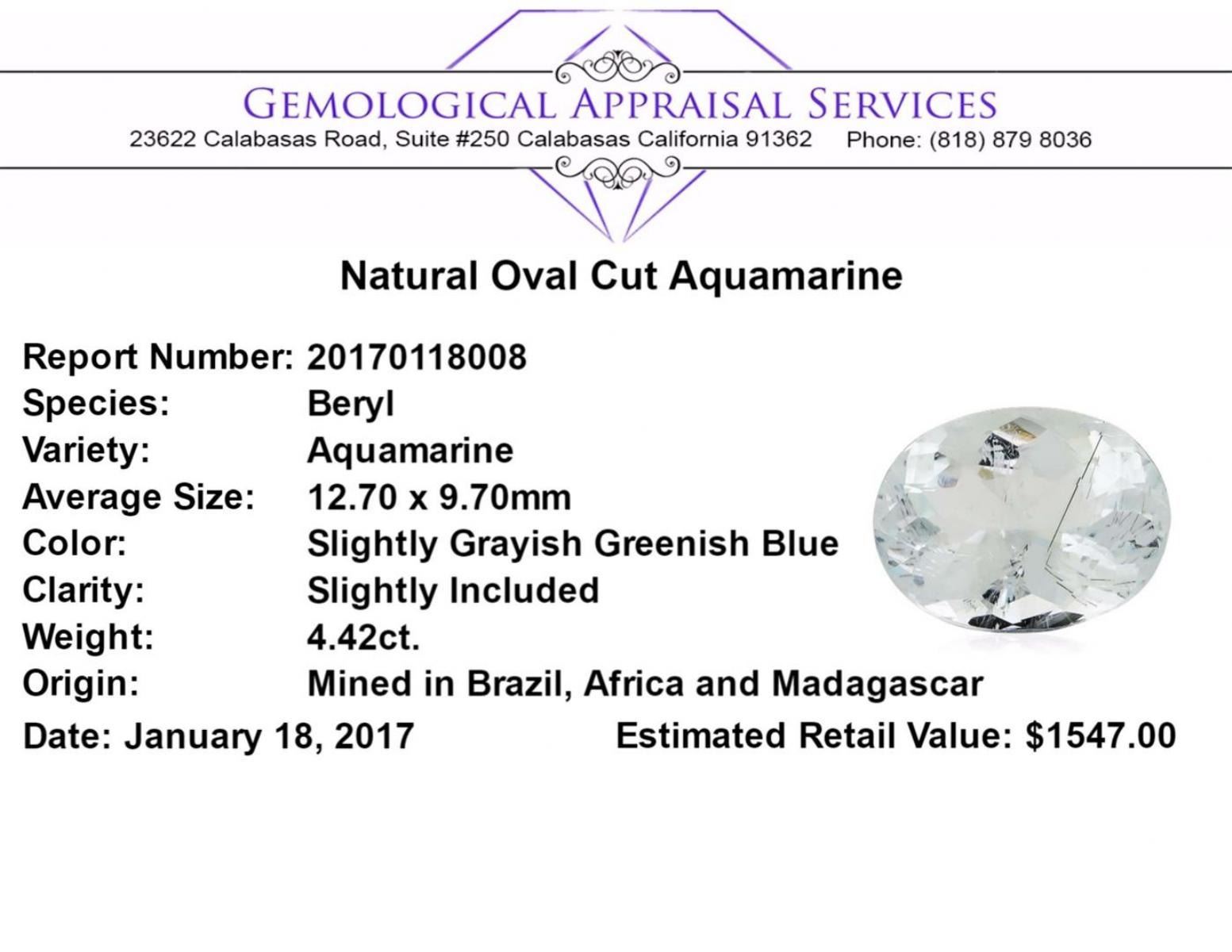 One natural oval cut aquamarine with an exact weight of 4.42ct., clarity is slightly included, slightly grayish greenish blue. Gemological Appraisals Services estimates the retail value at $1547 GAS Appraised.