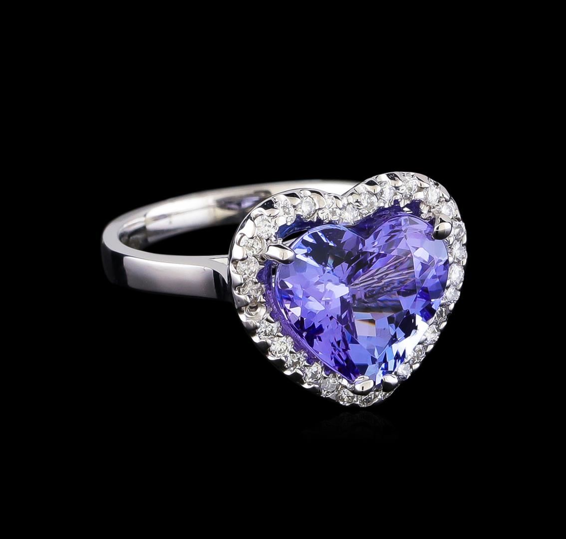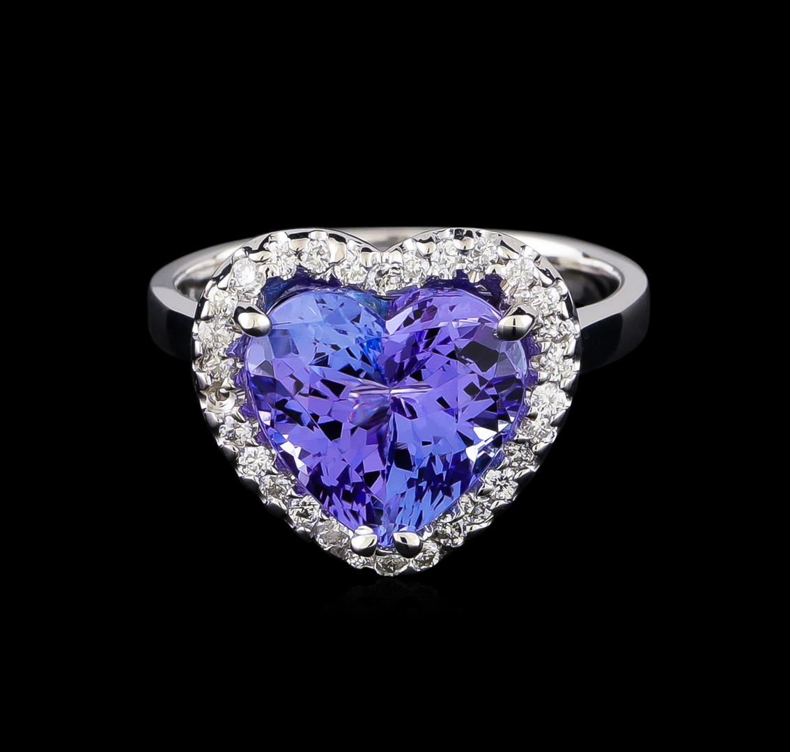 One electronically tested 14KT white gold lady's cast fashion ring with a basket halo with a bright polish finish. Condition is new, good workmanship. The featured lady's ring has a shank measuring 2.20 millimeters in width. Identified with markings of "K14". Containing: One pave' set heart modified brilliant cut natural tanzanite, measuring 10.65 x 10.01 x 6.00mm, (depth est.) approximate weight of 4.42ct., clarity is eye clean, medium light, very slightly grayish, violetish blue color, (GIA vB 4/3), cut is very good. Transmitting light with no distortion, transparent. Colored gemstones are presumed to have been subjected to commonly used enhancement processes. Graded in setting. Thirty prong set round brilliant cut diamonds, measuring 1.40 - 1.30 x 0.81mm (depth est.) approximate total weight of 30 Stones = 0.28ct. Graded in setting. Clarity: SI-1 to SI-2. Color: G-H. Cut: Good. Total Weight of Colored Stones: 4.42ct. Total Weight of Diamonds: 0.28ct. Total Weight of Rings: 5.10gm. GAS Appraised at $6,720.00.