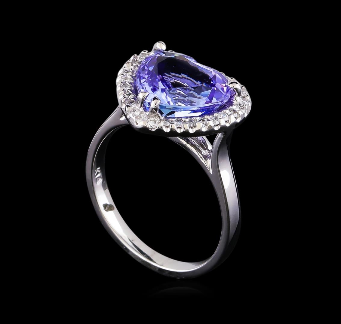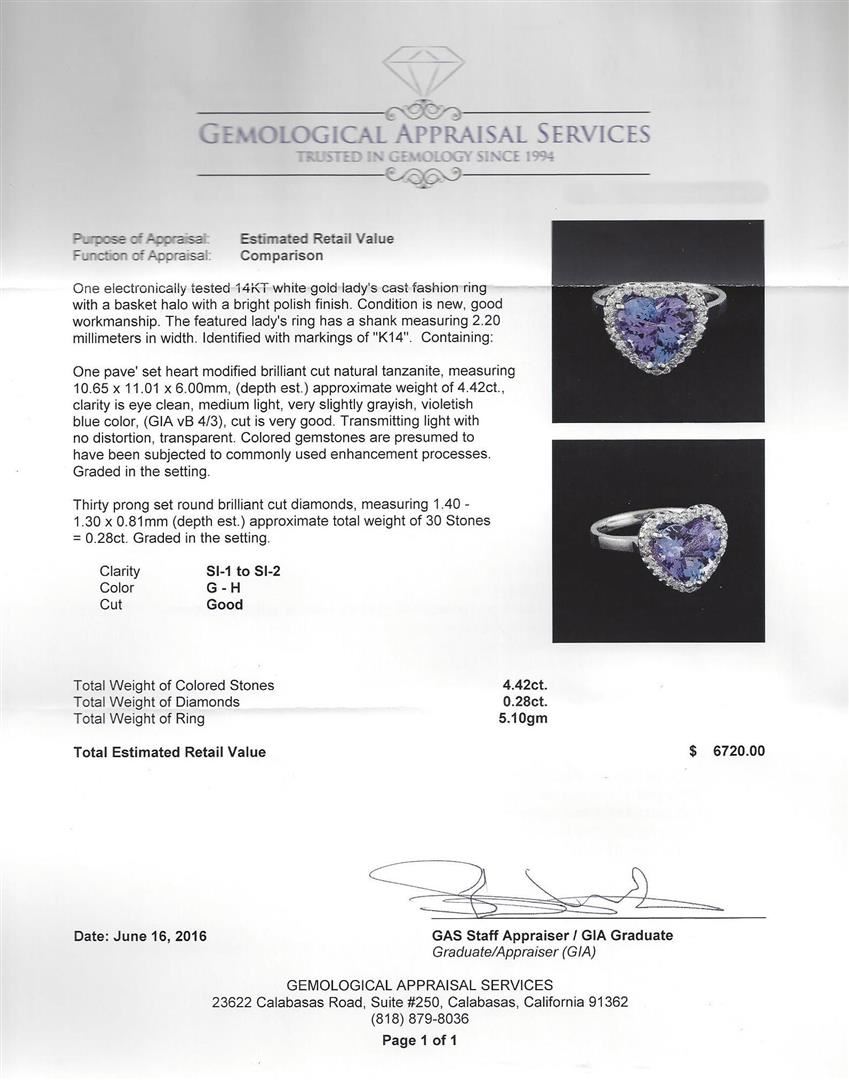 One electronically tested 14KT white gold lady's cast fashion ring with a basket halo with a bright polish finish. Condition is new, good workmanship. The featured lady's ring has a shank measuring 2.20 millimeters in width. Identified with markings of "K14". Containing: One pave' set heart modified brilliant cut natural tanzanite, measuring 10.65 x 10.01 x 6.00mm, (depth est.) approximate weight of 4.42ct., clarity is eye clean, medium light, very slightly grayish, violetish blue color, (GIA vB 4/3), cut is very good. Transmitting light with no distortion, transparent. Colored gemstones are presumed to have been subjected to commonly used enhancement processes. Graded in setting. Thirty prong set round brilliant cut diamonds, measuring 1.40 - 1.30 x 0.81mm (depth est.) approximate total weight of 30 Stones = 0.28ct. Graded in setting. Clarity: SI-1 to SI-2. Color: G-H. Cut: Good. Total Weight of Colored Stones: 4.42ct. Total Weight of Diamonds: 0.28ct. Total Weight of Rings: 5.10gm. GAS Appraised at $6,720.00.