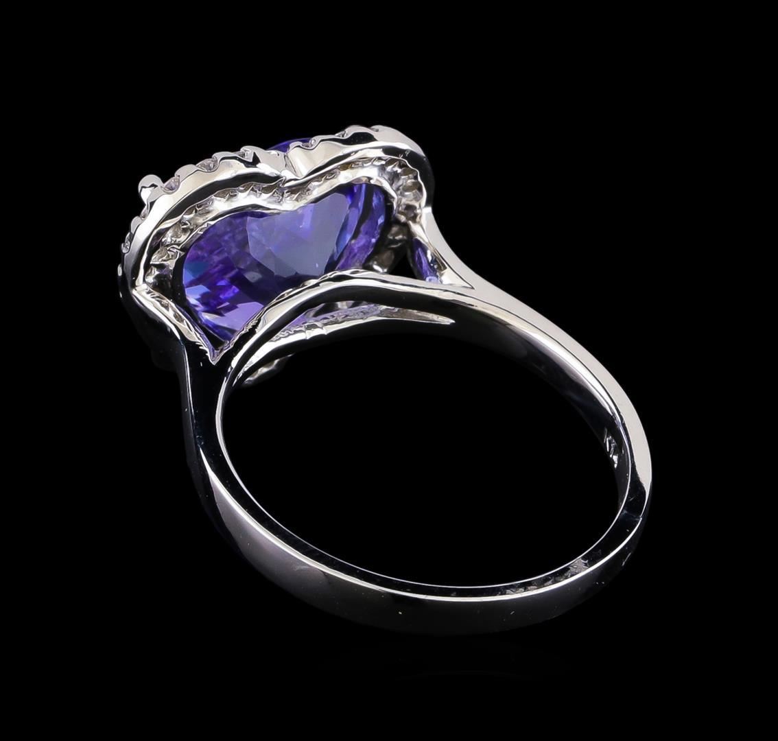 One electronically tested 14KT white gold lady's cast fashion ring with a basket halo with a bright polish finish. Condition is new, good workmanship. The featured lady's ring has a shank measuring 2.20 millimeters in width. Identified with markings of "K14". Containing: One pave' set heart modified brilliant cut natural tanzanite, measuring 10.65 x 10.01 x 6.00mm, (depth est.) approximate weight of 4.42ct., clarity is eye clean, medium light, very slightly grayish, violetish blue color, (GIA vB 4/3), cut is very good. Transmitting light with no distortion, transparent. Colored gemstones are presumed to have been subjected to commonly used enhancement processes. Graded in setting. Thirty prong set round brilliant cut diamonds, measuring 1.40 - 1.30 x 0.81mm (depth est.) approximate total weight of 30 Stones = 0.28ct. Graded in setting. Clarity: SI-1 to SI-2. Color: G-H. Cut: Good. Total Weight of Colored Stones: 4.42ct. Total Weight of Diamonds: 0.28ct. Total Weight of Rings: 5.10gm.